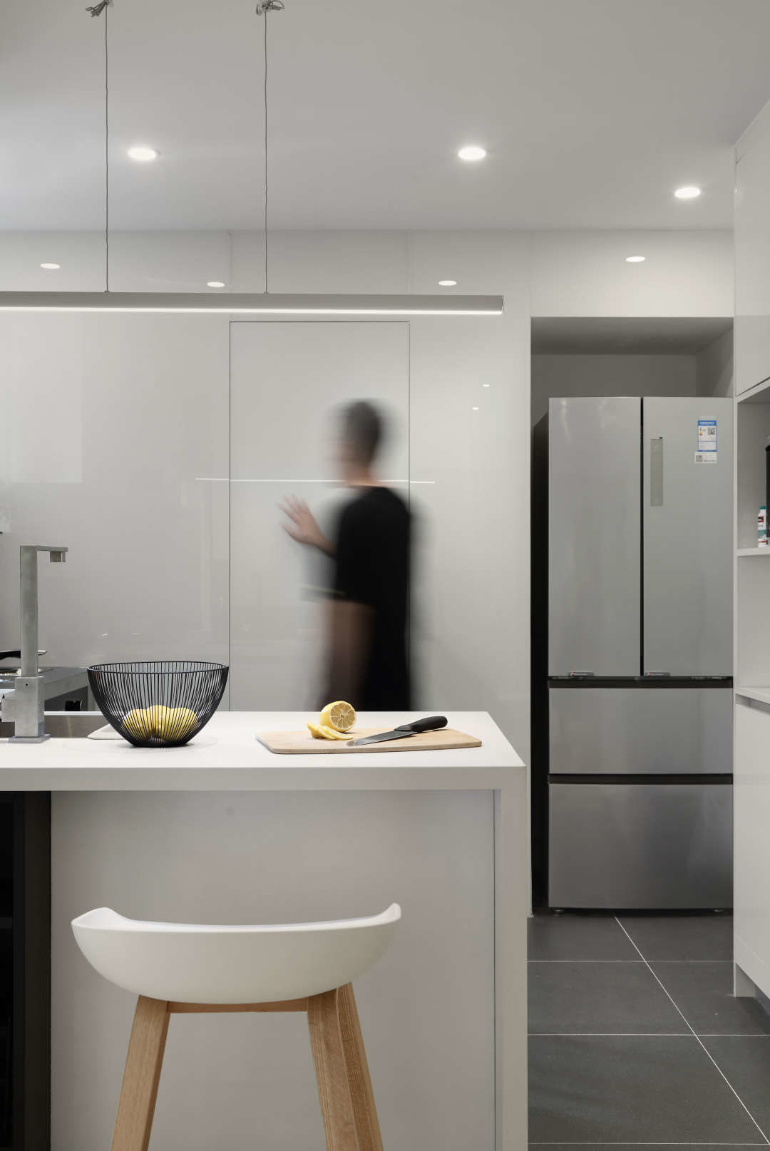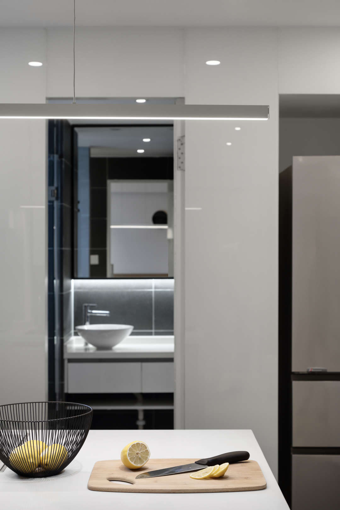 超白玻璃让整个厨房空间看起来更大,因为玻璃表面略带反射.隐形门后面藏了一个很大的卫生间
