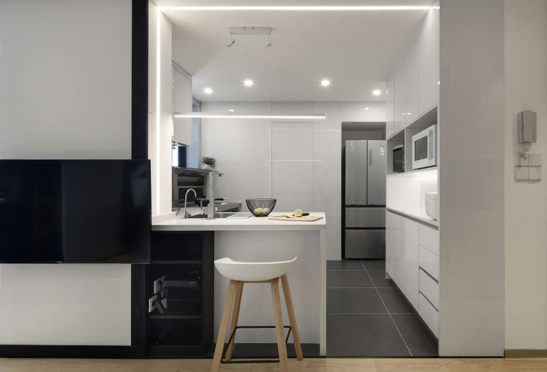 厨房考虑到打理方便,整面墙做了超白的烤漆玻璃,同时把卫生间门隐藏在里面.最右边利用马桶间的空间退进去留了个冰箱位置.如此一来,马桶间又不浪费,厨房里面又把冰箱位置的难题顺利解决,而且不突兀.烤漆玻璃的按照方式,先在基层打底,打完底后直接把超白钢化玻璃粘上去.注意一点,边缘区域不要打胶,不然很容易碎.因为有张力.