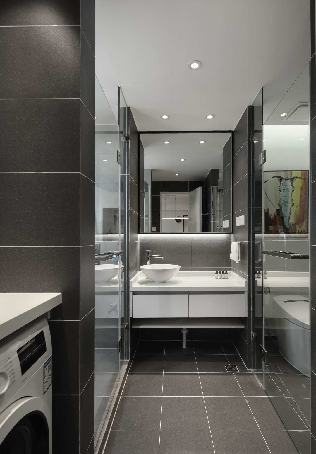 卫生间在功能上大致分了几个区.进门口是放洗衣机的位置,上面是一组吊柜,右手边是挂毛巾和浴巾的位置.正对面是台台盆区,台盆区域,在灯光上的设计也是特别有讲究,镜子下出光,台盆正上方区域做了2个射灯,人站的上方后面区域也安装了一个射灯,如此一来,在镜子前照镜子人可以显得更加立体.台盆左边是淋浴房,右边是马桶间.玻璃用了雾化玻璃.开关可控制磨砂和透明.如此一来,每个空间都可以同时使用.