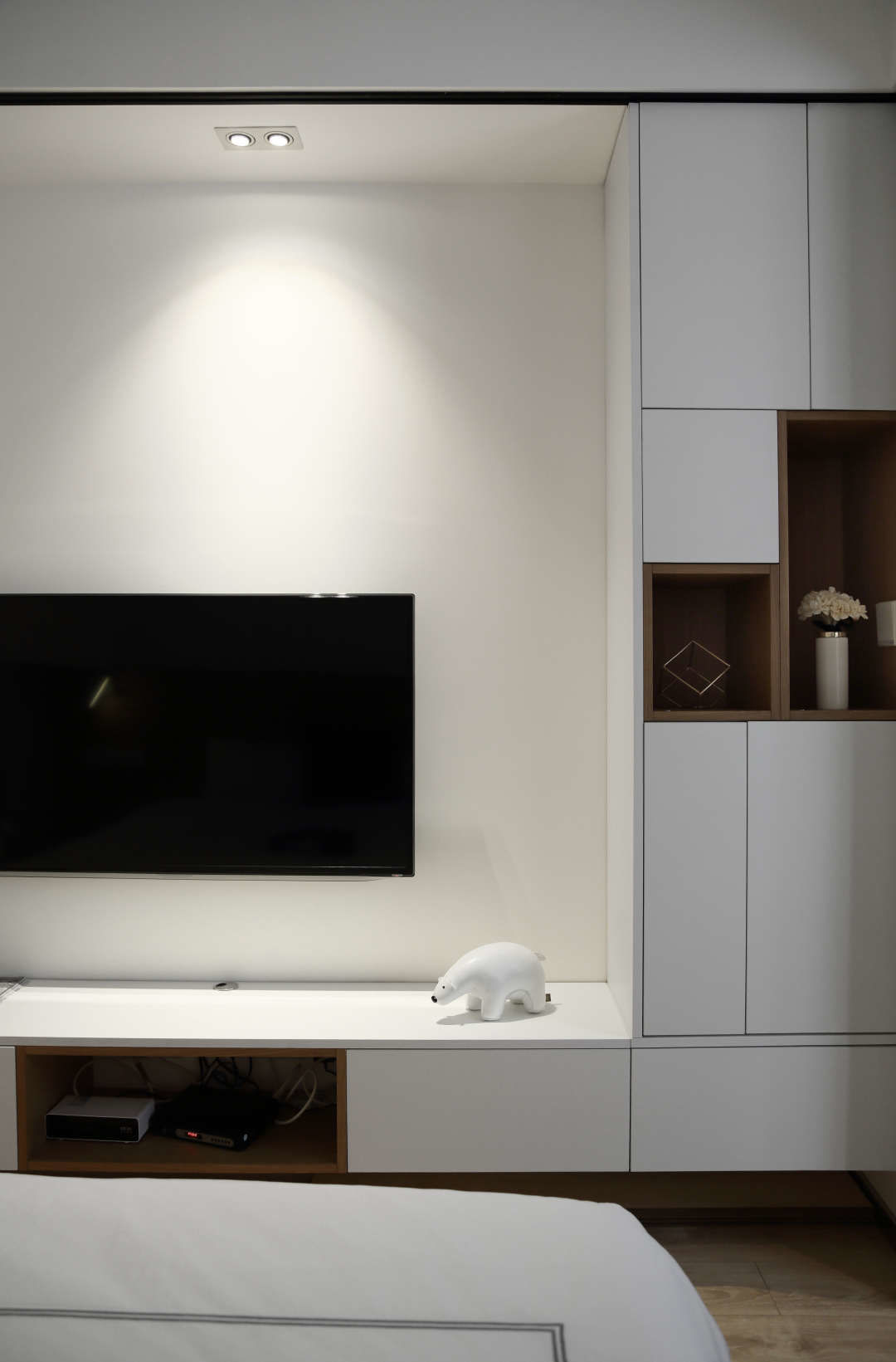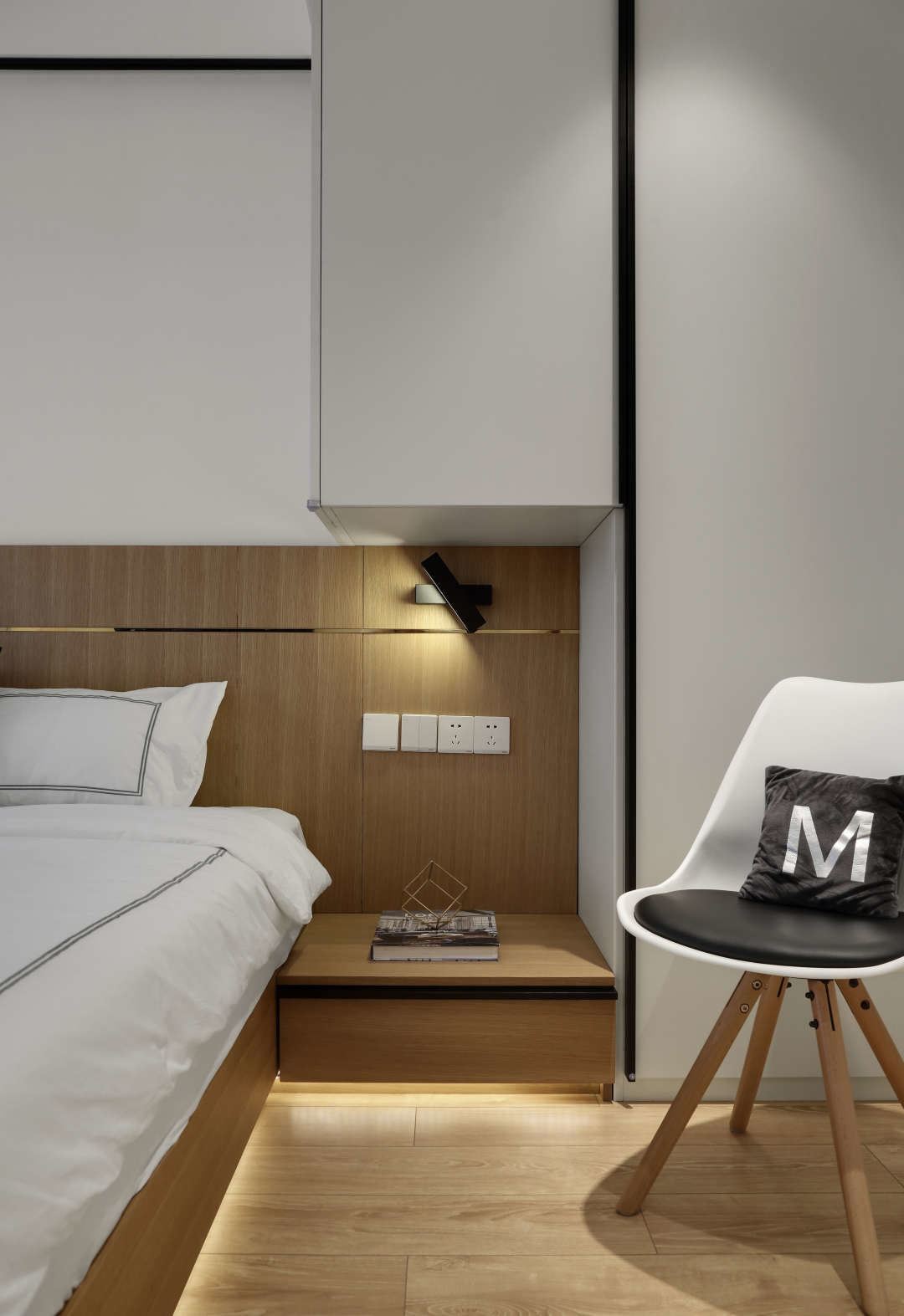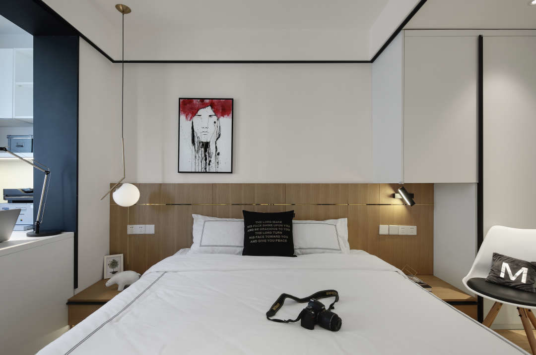 储物空间尽量多,在右边床头柜上方,让衣柜继续延伸过来.可旋转的床头壁灯.不仅实用,也是一种点缀