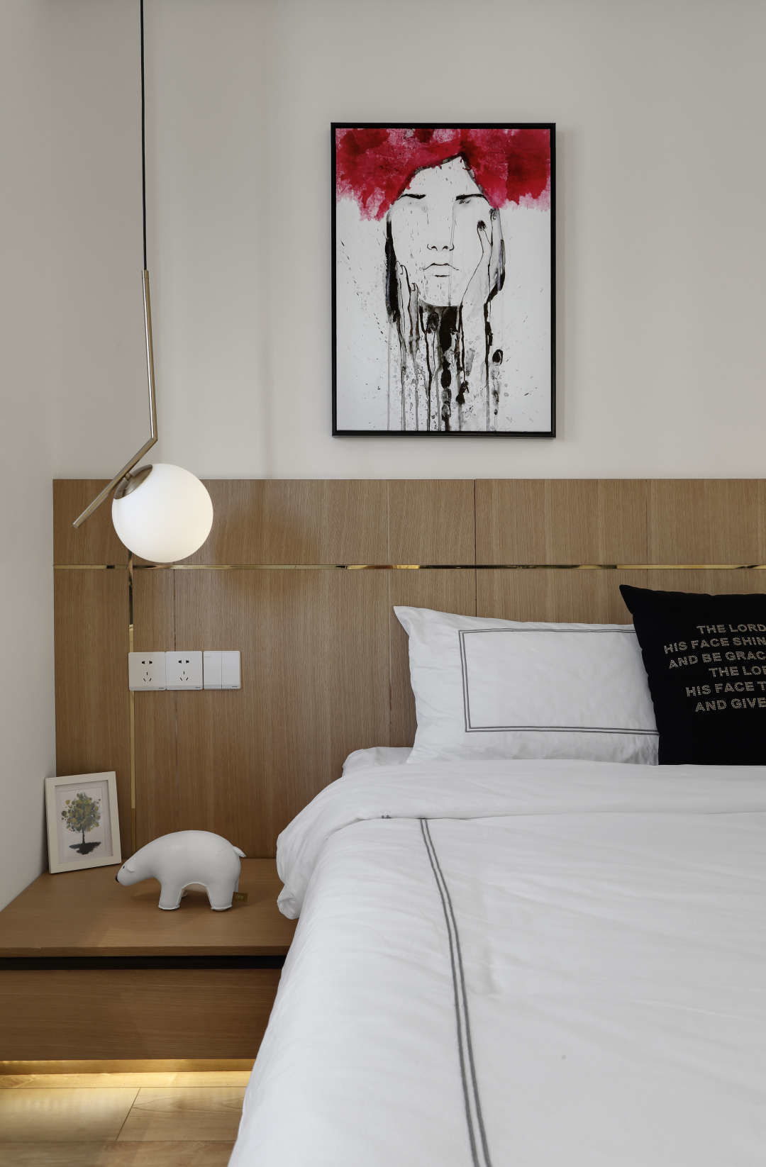 为了床背景显得不那么单调,床背板中嵌入了香槟金线条,跟左边的吊灯相呼应.整个背景更显精致.香槟金线条是直接粘贴上去,事先在定制的床头板上留好1公分槽.不用担心日后会凸起起翘