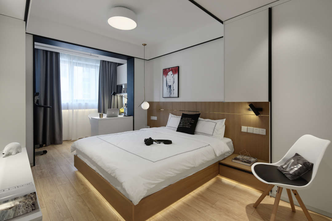 小房间其实做了蛮多的储物设计,连床的下方也是做了抽屉.漂浮的折板从墙面延伸到顶上,让这个空间有个违和感,靠近床头的下方特地没做灯带,就是想让床头能有种眼神.让空间有跟多的变化.呼应餐厅区的设计.层次感多变.床右边区域做了敞开格子,平时可以放些装饰品或者书,左边书桌上方也做了敞开格收纳.