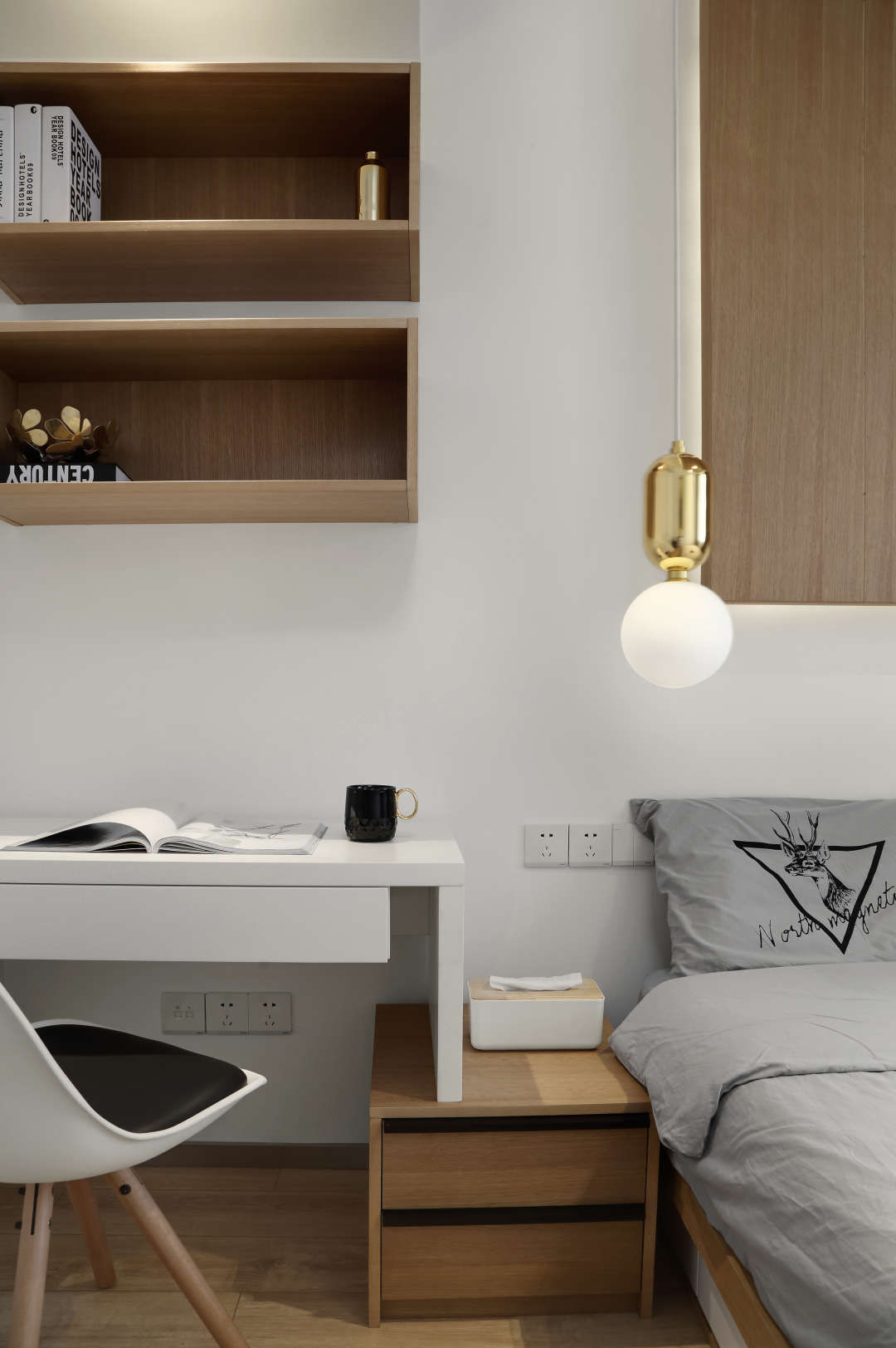 书桌也是一边高一边低,其实是特地这么处理,让书桌看起来不那么呆板.床头边的灯泡吊灯正好和右边的台灯是一个系列.样子一样颜色不一样.求同存异,这就是细节.