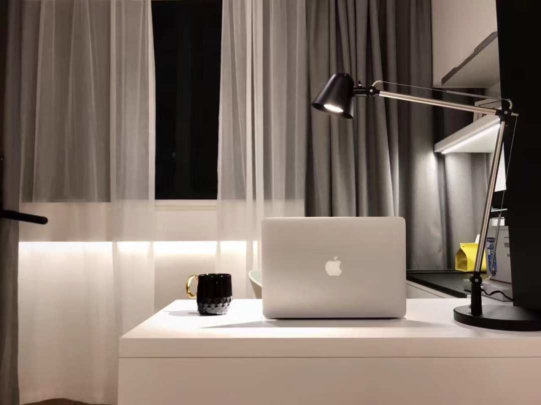 改造前的阳台完全就是堆放杂物,利用率太低,改造后,这块区域变成了一个书房,还放了一个跑步机.书桌上方的吊柜下面也是细心到做了灯带.