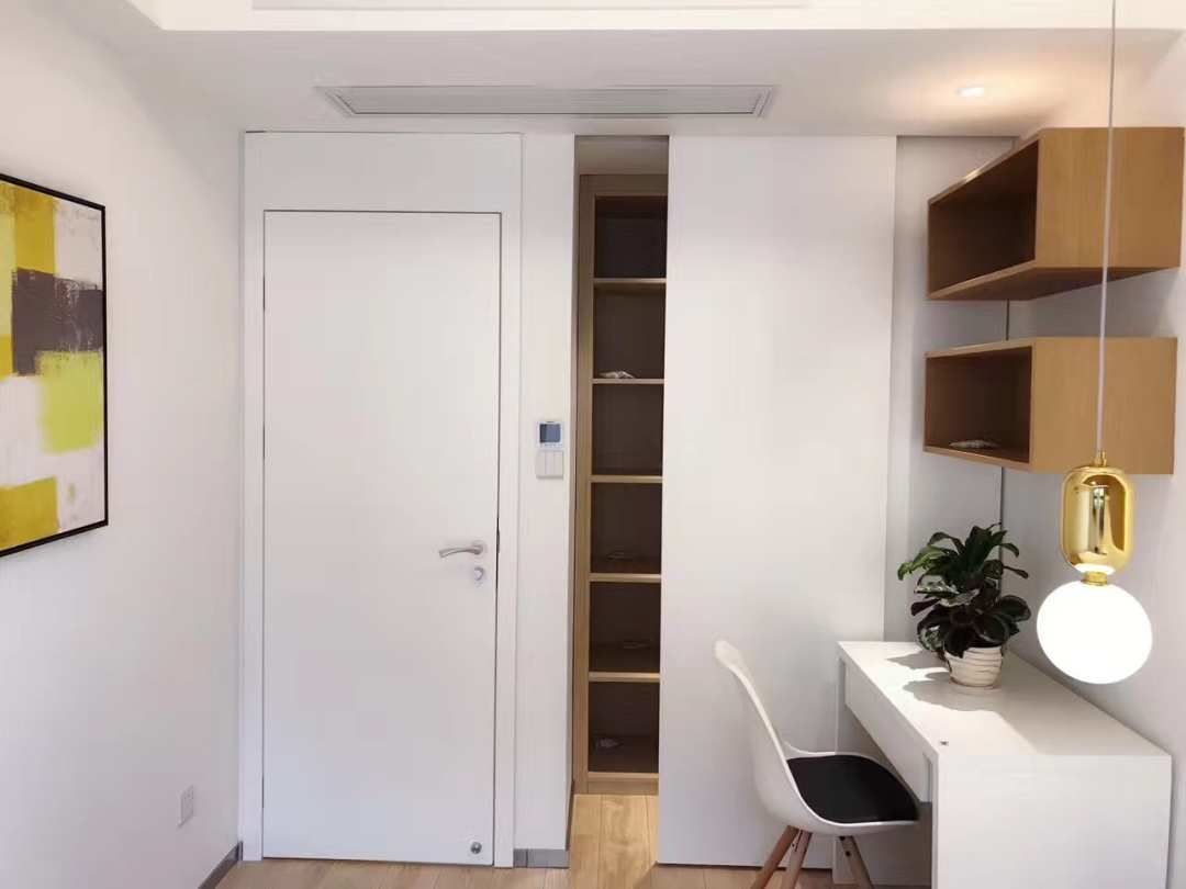小房间进门口的左手边做了个小型衣帽间.移门关上的时候犹如一面白墙.非常美观和实用.几乎每个小犄角旮旯都利用起来了,别看很小,平时旅行箱这些都可以直接往里面塞.用起来特别方便.