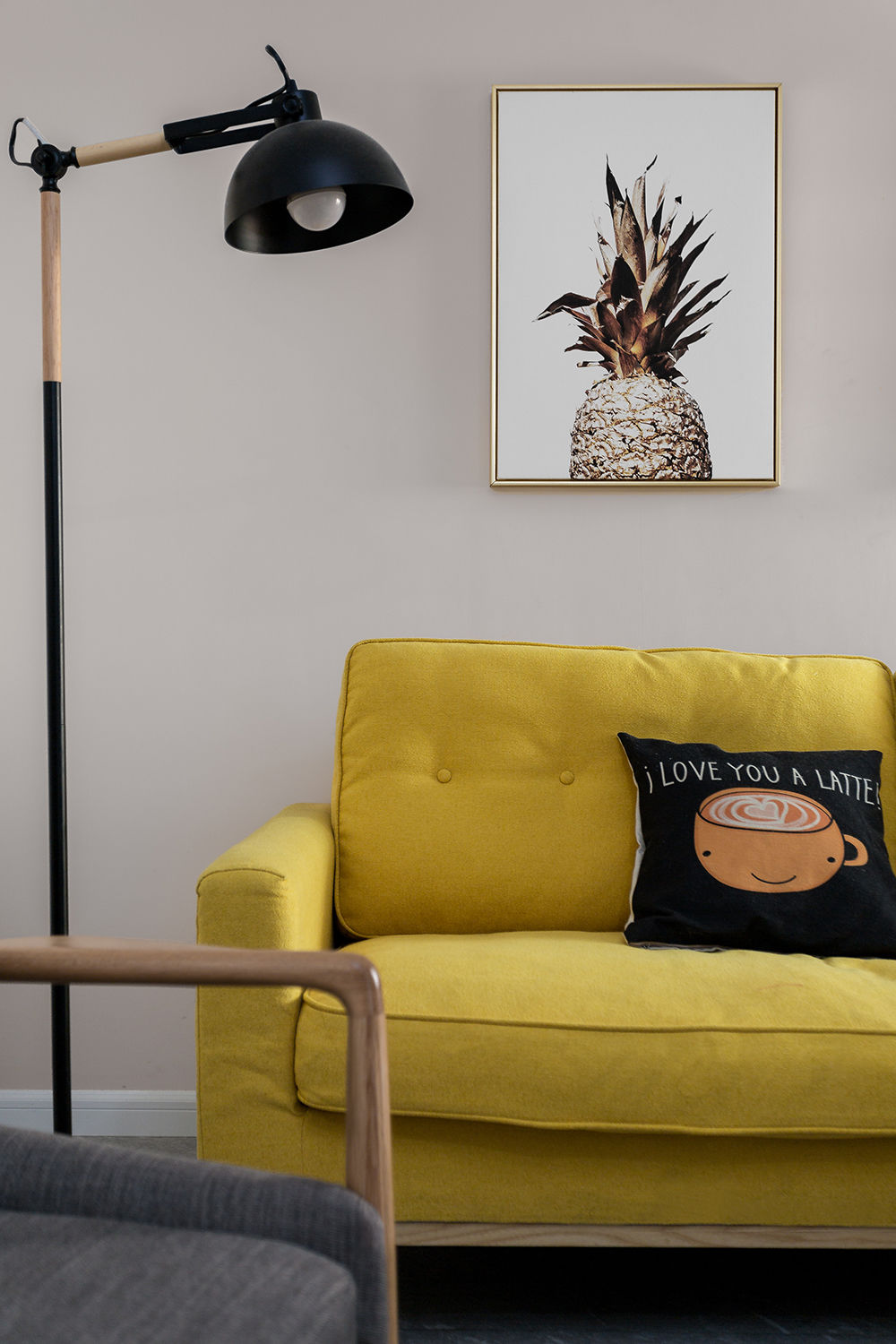 客厅的墙面米色为主调,在色彩的感觉当中,属于视觉感觉像后的色彩,在整个客厅的空间里,需要一个纯度比较的同色系的去点缀,黄色的沙发也是业主喜欢的颜色。#落地灯#黄色