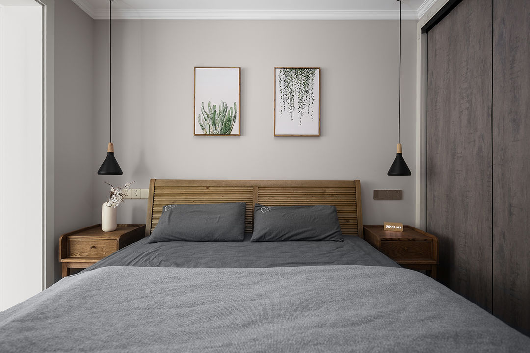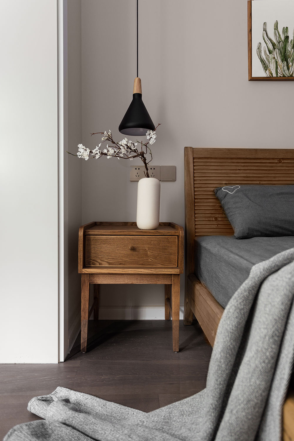 主卧室的墙面的也是业主比较喜欢的米色,结合一些原木色的家具,床品相对颜色比较深,整个空间有了色彩的对比,家具也是典型的北欧家具,看上去既简单又清爽。#卧室#原木色