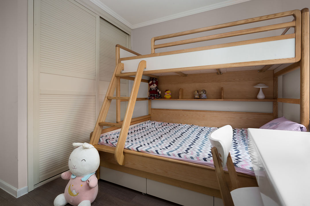 大女儿房间选用了高低床,做了备用,家里来客人的时候,可以用的上,把孩子的学习和休息都融入房间。#粉色