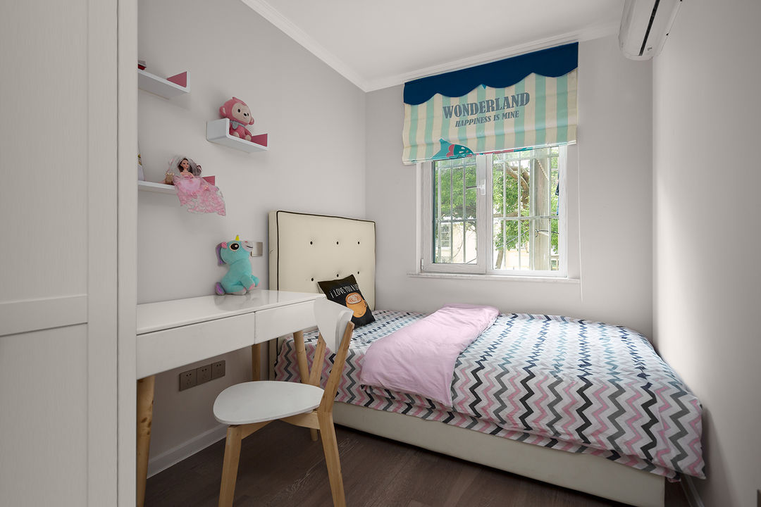 小女儿的房间,以白色和粉色为主,小孩休息和学习都在卧室了,不会影响到孩子的学习。@儿童房@粉色