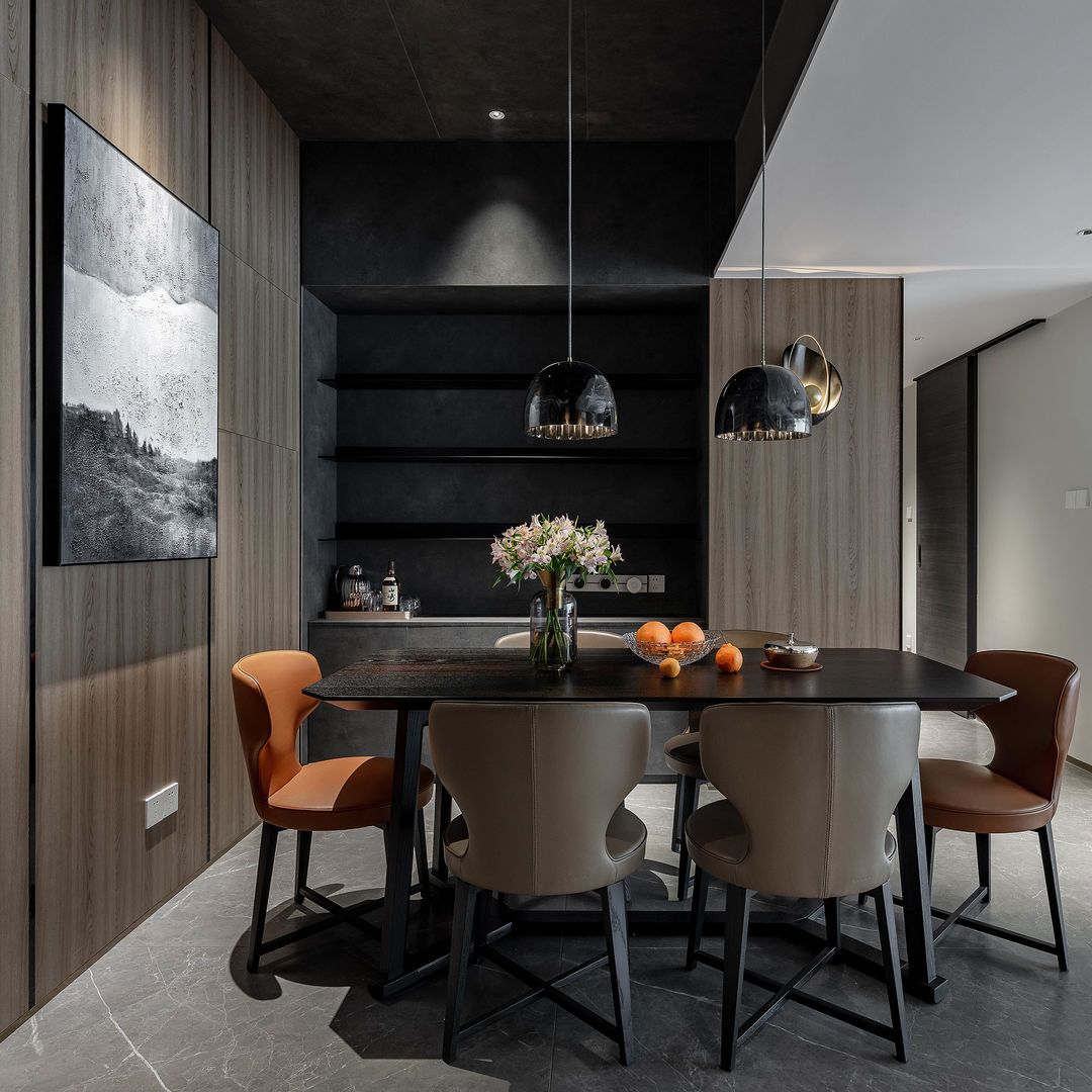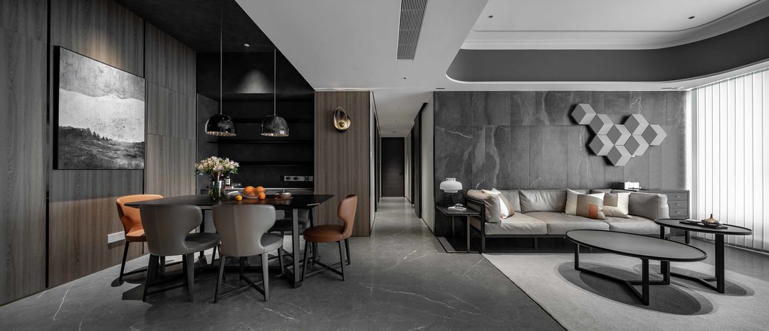 屋主陈先生是一位儒雅的70后,饱读诗书且看过大千世界,整体装饰元素都是沉稳克制的,灰调的材质虽暗却明,点缀零星橘色软装提亮空间。随着孩子长大,父母适当放手,一家人可以更多的关注自己,空间布局是分离又联合的。