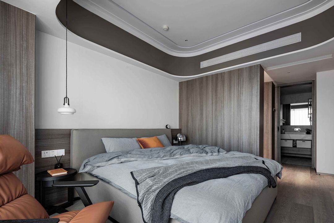 进入主卧后先看到衣帽间,衣帽间临近主卫,梳妆台背靠卧室也设置在此。如果夫妇二人有作息不同的情况,不会因为更衣梳妆的光线而影响睡眠。