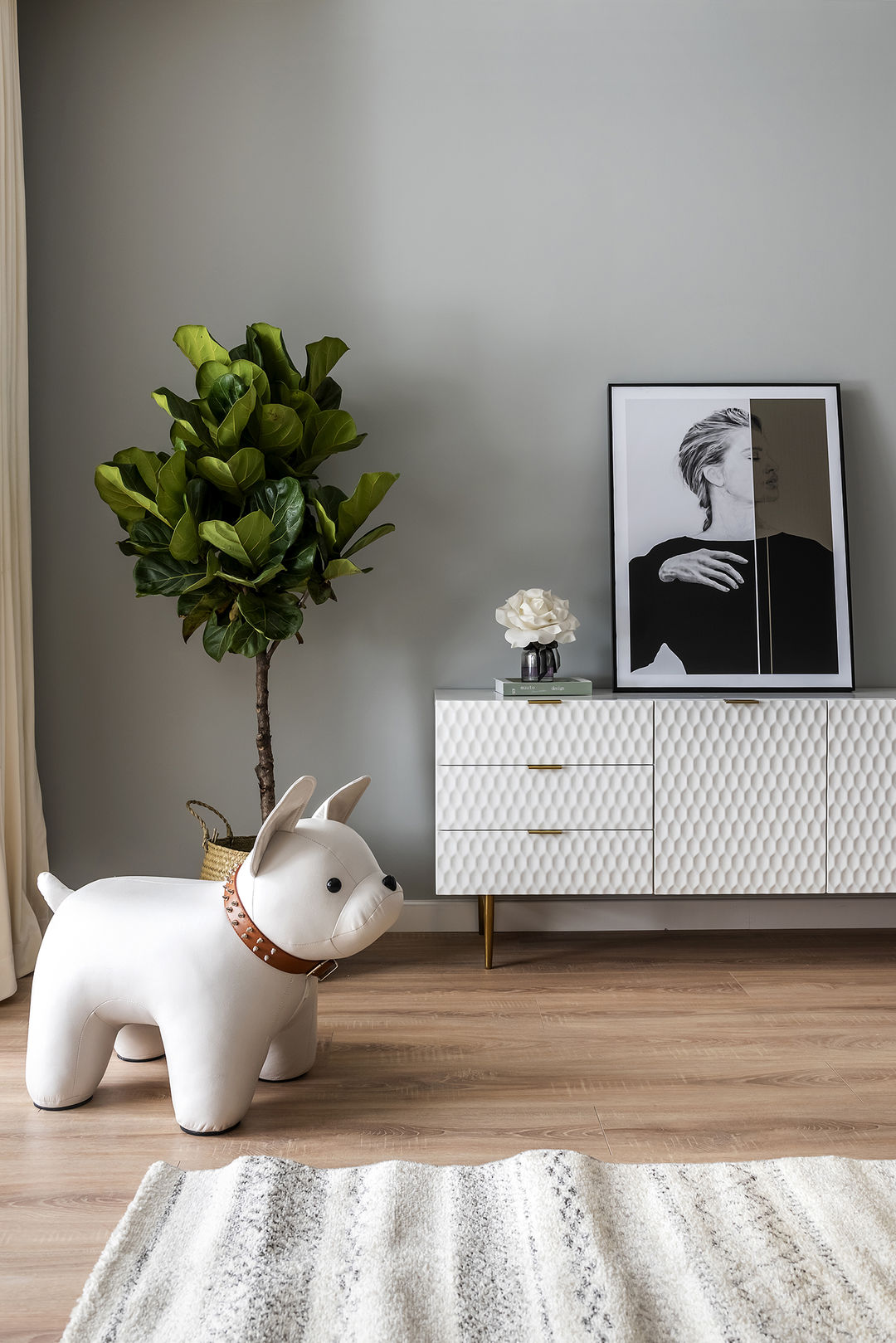 主卧黑白几何形状的镂空窗帘带来一种隐约的美感,这种似有似无的艺术境界,为空间打造出独特的设计韵味。