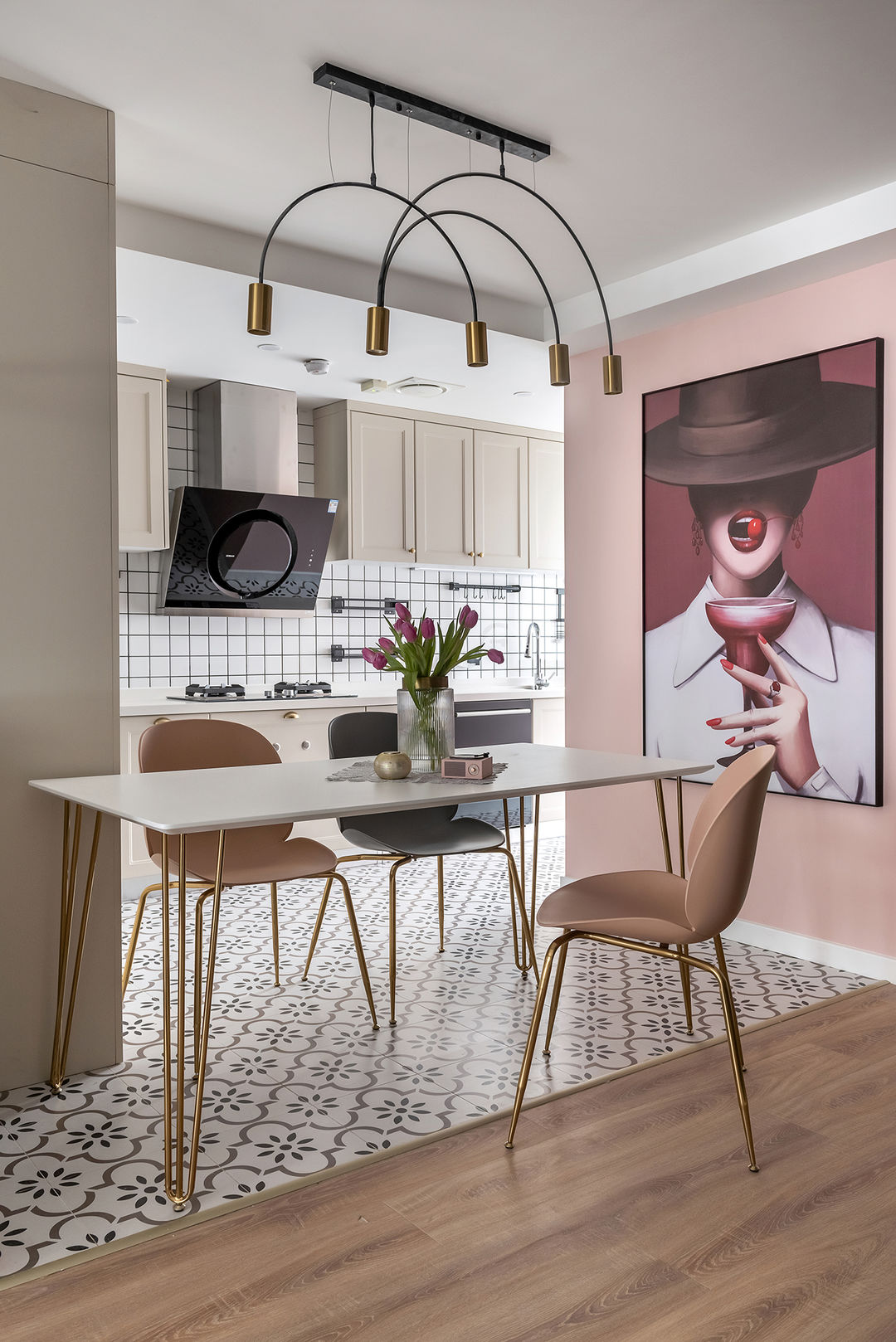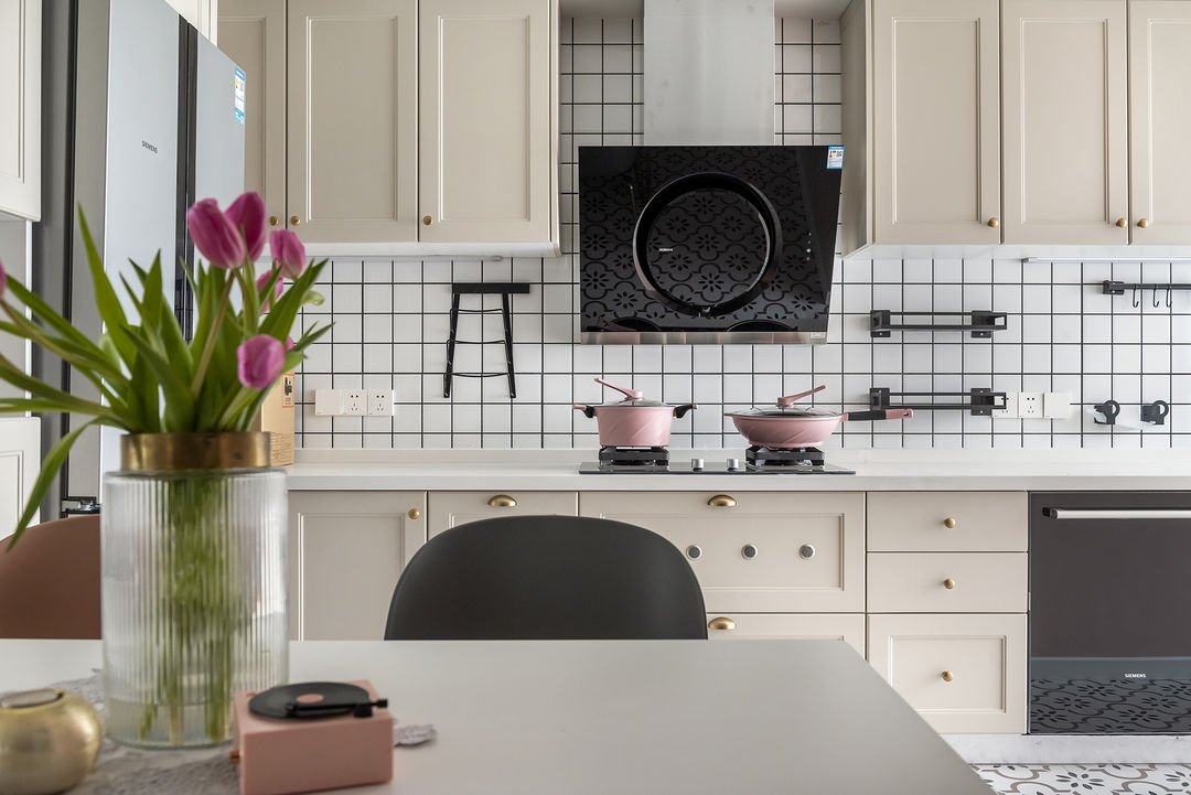 厨房,干净的墙面小白砖,独特的地面花砖,干净整洁的灶台,米灰色的橱柜,以粉红色的锅点缀提亮,从视觉效果上,又使空间富有变化,整个空间具有层次感。