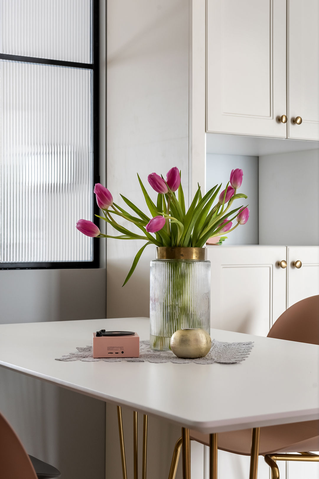 开放式餐厅与厨房融为一体,粉色雅致的背景墙,干净的花砖与木地板的相碰撞,让空间在无形之中又有区分。干净白色的餐桌上的吊灯非常吸睛,使得格调满满的,开放式的厨房让餐厅光线充足,开阔的视野让用餐变得更有趣。