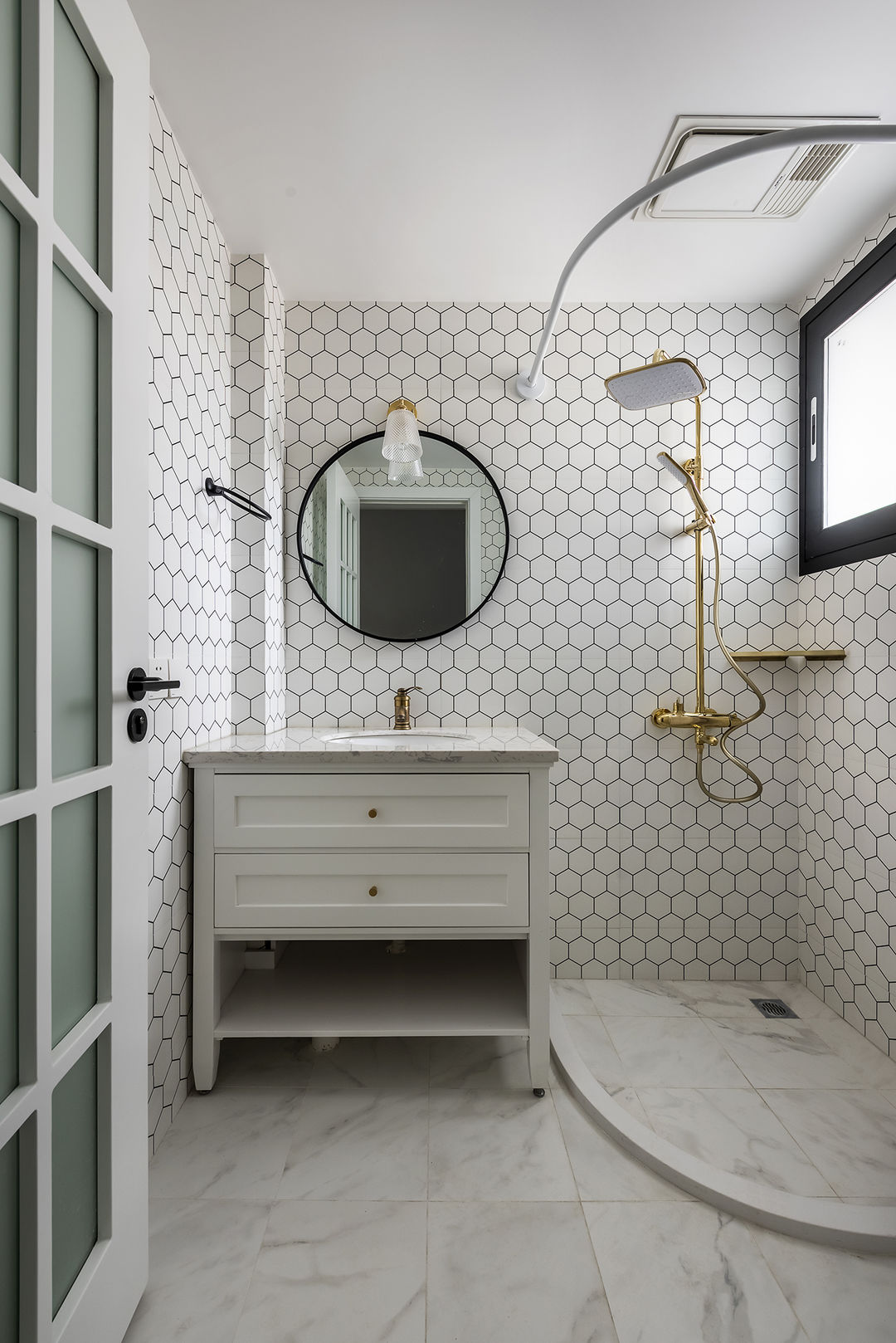 公卫,地面是哑光爵士白仿古石材地砖,墙面是干净的蜂窝砖,简约的洗手台精致时尚,沐浴区金色的淋浴花洒与蜂窝墙砖的搭配,让整个空间更有时尚艺术感。