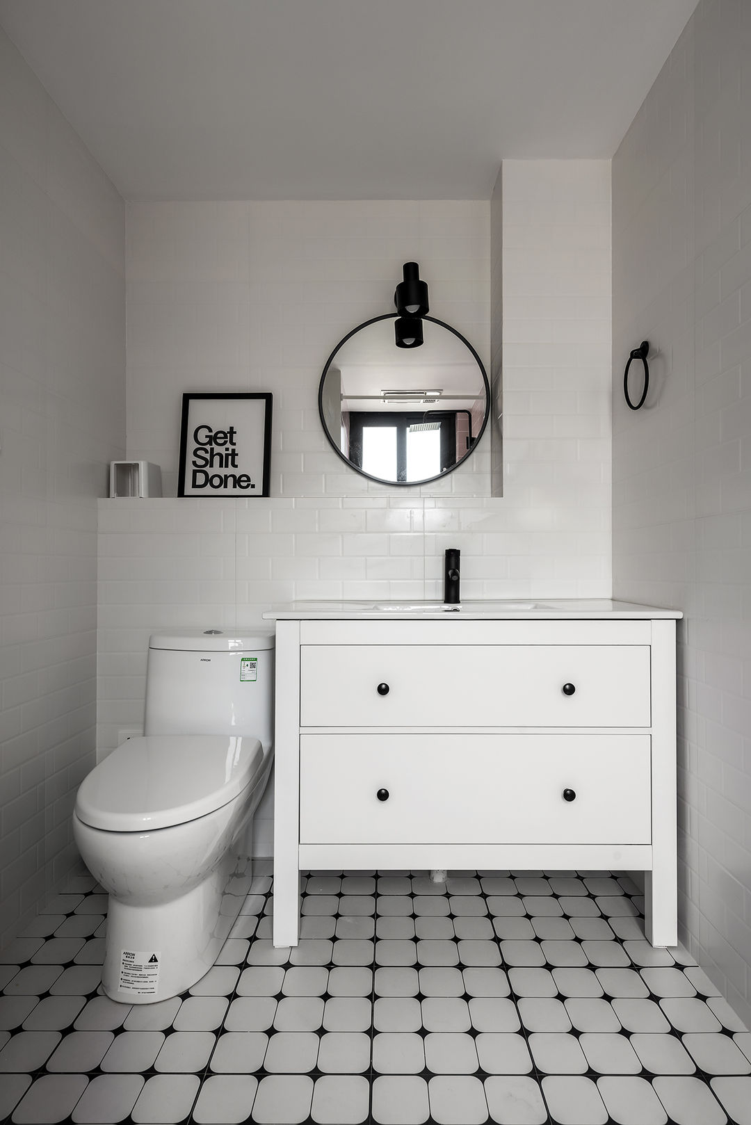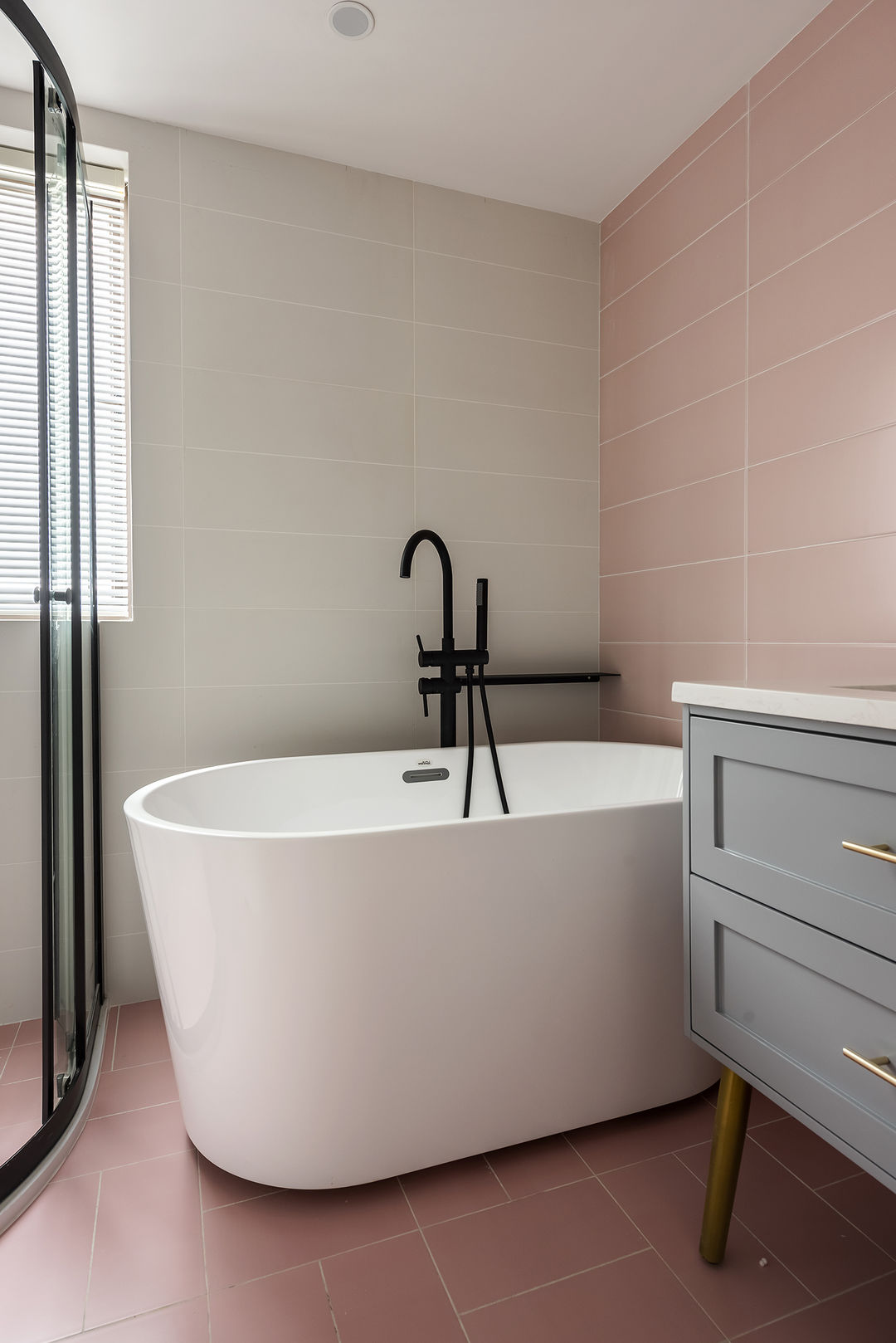 白与粉的墙砖跟黑色落地水龙头有种高级感,整个环境的显得一切是那么的温暖而安静。