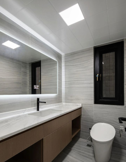 一般建议安装镜前灯,吊灯、筒灯、灯带均可,如果前期没有安装,后期可在镜子周围加装灯带,也很方便,这个就需要提前预留电源线路。