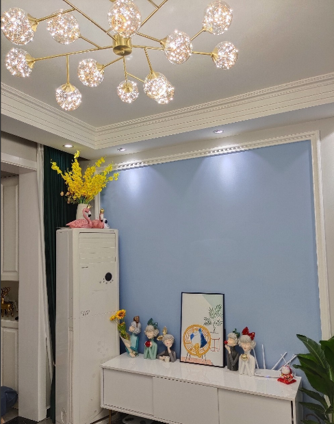 为了空间没有那么单调,做了比较简单的客厅电视背景墙,刷了蓝色乳胶漆,然后走了一圈石膏线条,即使现在还没电视机,也不影响整体的效果。白色的电视柜觉得还不错,可以提供蛮不错的储物空间。电视墙布置那么重要,直接刷乳胶漆效果也很好看,而且对于年轻人的新房来说,搭配一些颜色,特别好看。