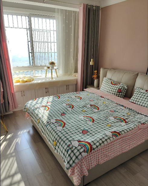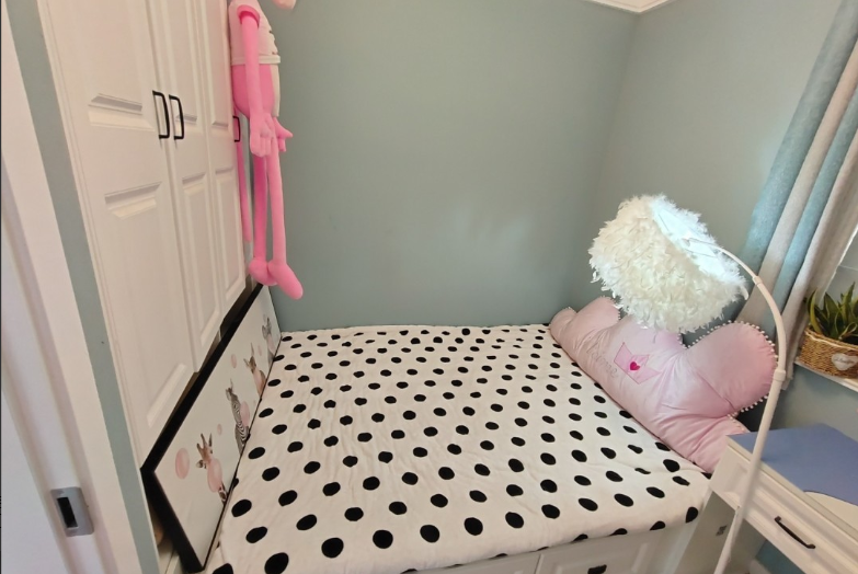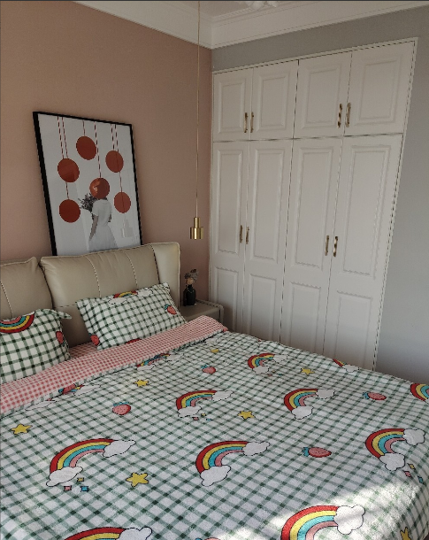 主卧考虑到实用性,把原来的飘窗打掉,改做了非常实用的餐边柜,可以提供蛮不错的储物空间,还可以保持着原来飘窗的造型,非常实用。布置了一张双人大床,睡着很舒服。床头背景墙没有做造型,刷了粉红色的乳胶漆,颜值很好。床头两边安装了小吊灯,晚上可以方便增加二次照明,非常满意。衣柜是做了嵌入式的,可以增加一些储物空间,特别实用。