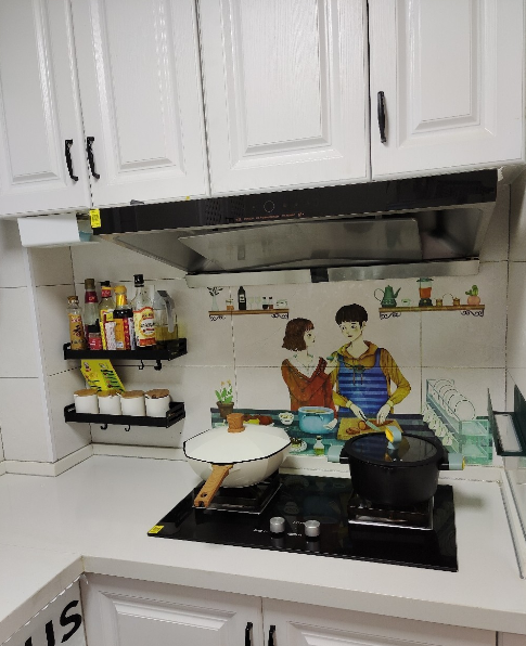 这是厨房,定制了白色的橱柜,燃气灶墙上做了一些装饰,显得比较好看,太温馨,太幸福的画面了。墙上的空间利用起来,安装了非常实用的置物架,可以方便收纳一些调料,非常实用。