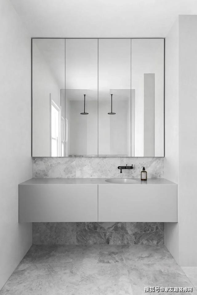 常见的浴室柜是四角落地的,这样与地面留下了一个不大不小的空隙,打扫起来非常尴尬,所以不如直接抬高,做成悬空式的浴室柜,这样减少卫生死角颜值还高。