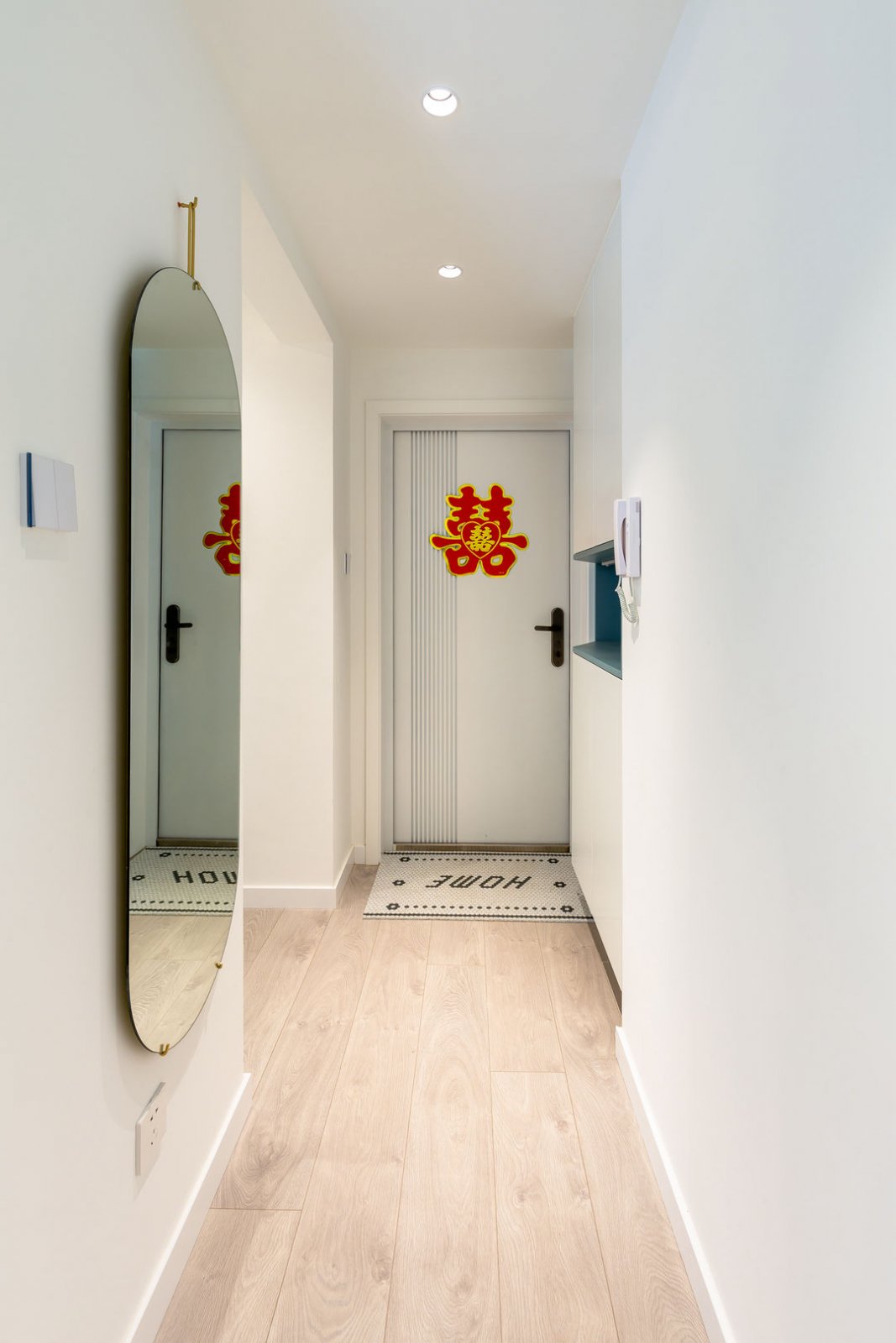 站在玄关处一端看到通往次卧的走廊,同时也是由动转静的眼,从某宝上购买的防滑垫也是如此创意且时尚,卫生间门应用长虹玻璃搭配黑色边框,依旧走在了时尚的边缘