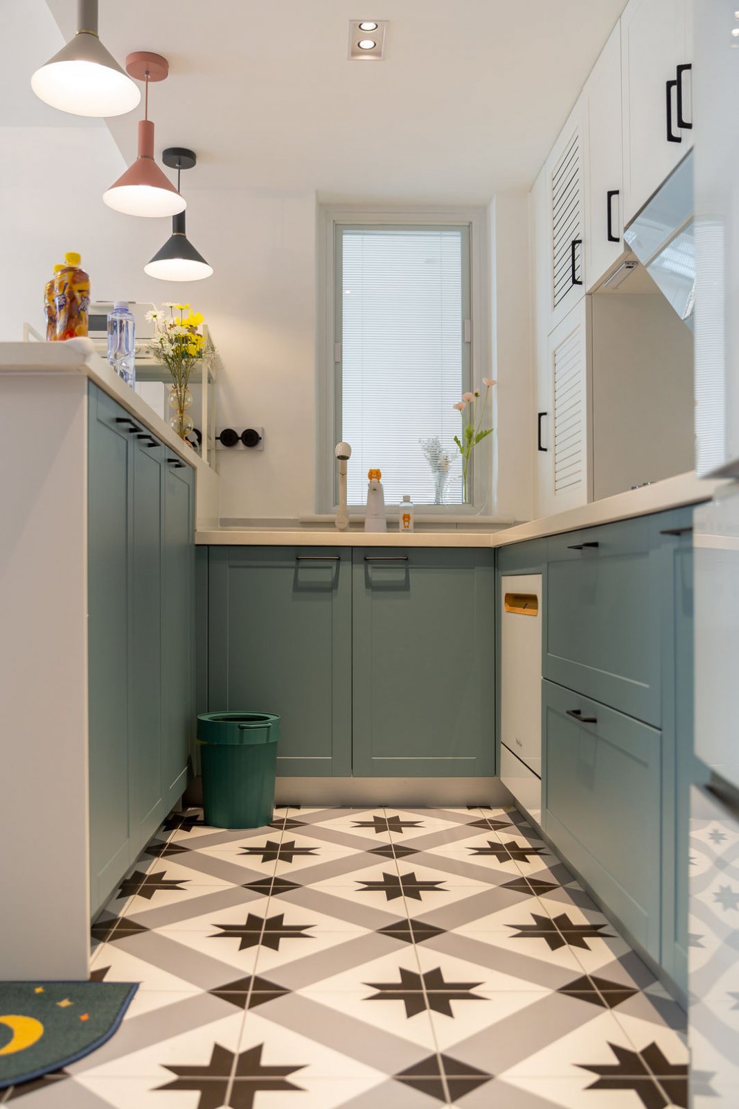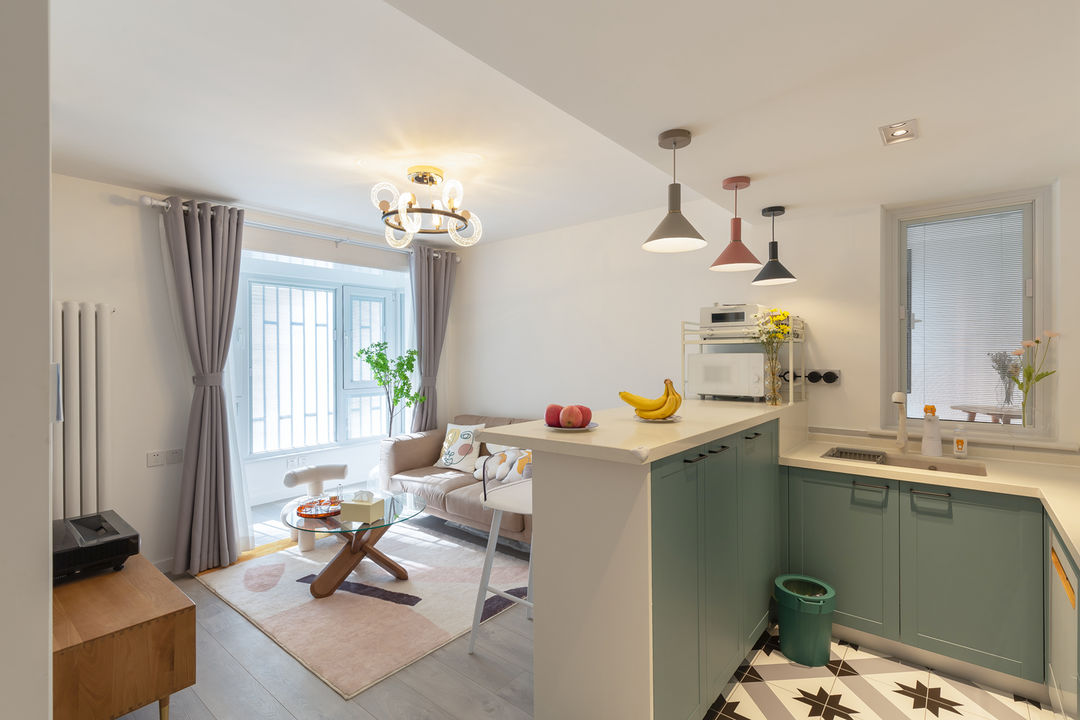 开放式的格局,让客餐厅之间和谐相通,吧台的设计也很好的进行区域分割,隔而不断,减少空间的压抑和局促感,让空间更加通透。白色及灰绿色搭配的橱柜,显得更加清新自然。