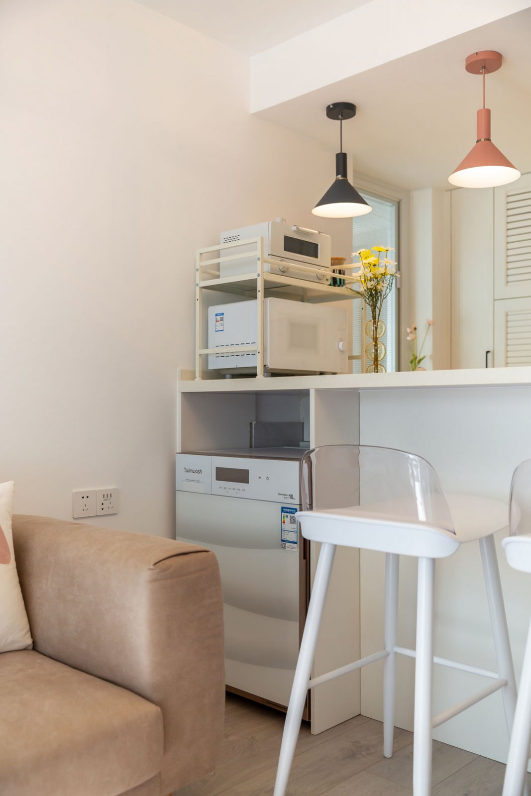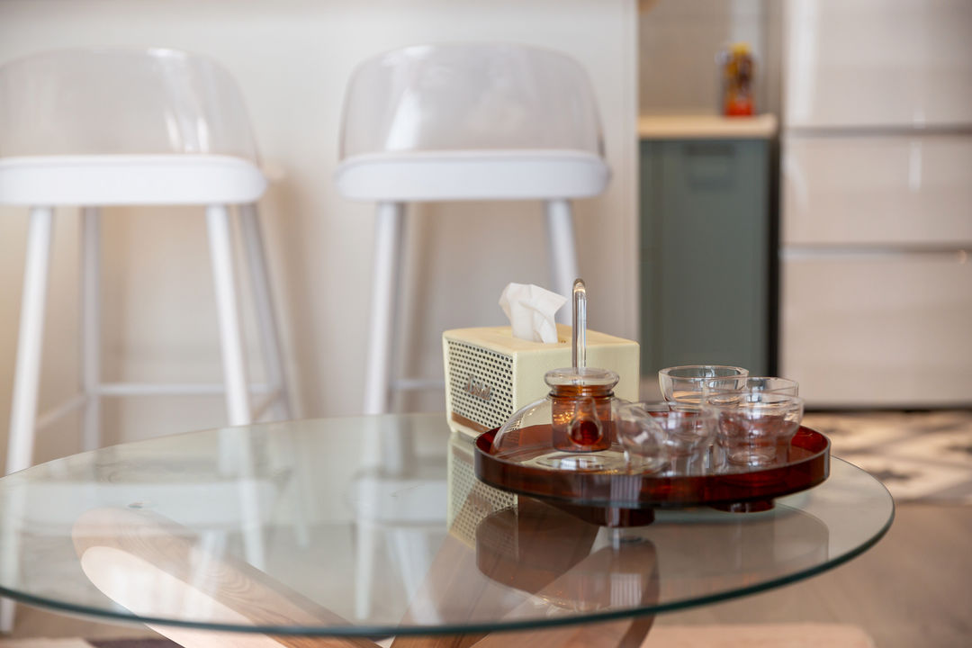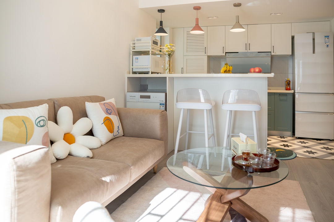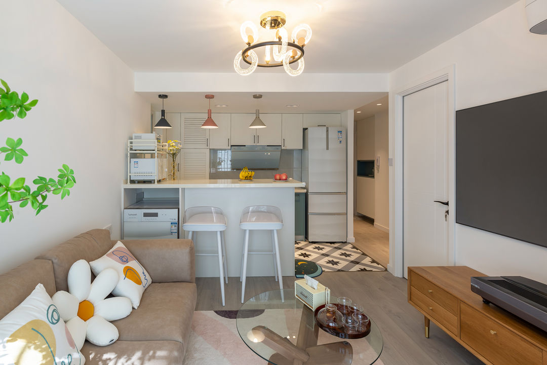 空间的限制,改造开放式厨房、餐厅、吧台集于一体,满足新婚小两口的使用,不经常在家烹饪的二人,吧台满足了临时用餐的需求。考虑到偶尔会有朋友做客,所以准备了多功能茶几,人多也不怕。
