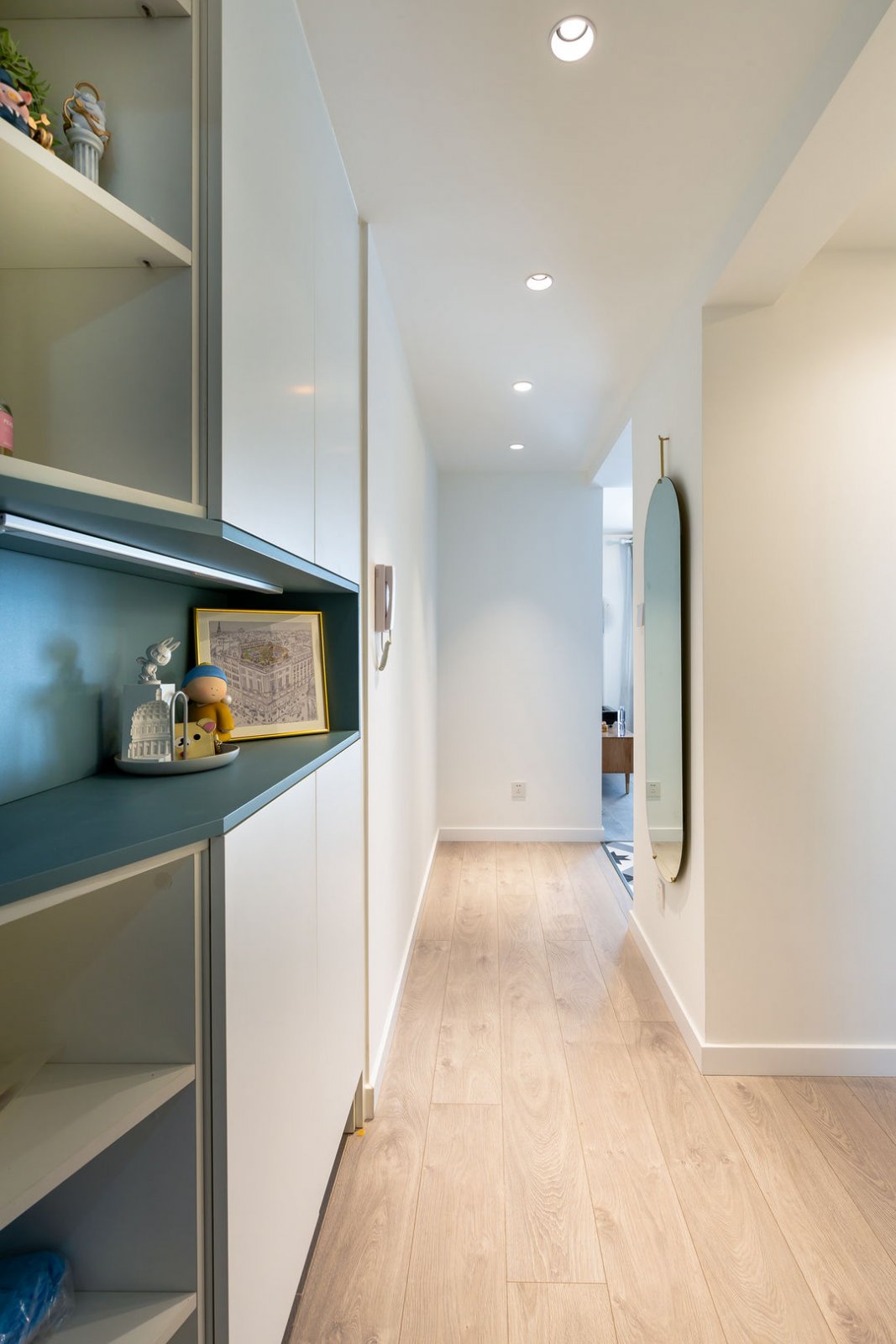 玄关经改造设计后拉伸空间,入户门处做定制通顶储物柜,白色与海军蓝两者搭配,给人一种心旷神怡的感觉,颜值超高的悬挂式全身镜,早上出门也要美美哒