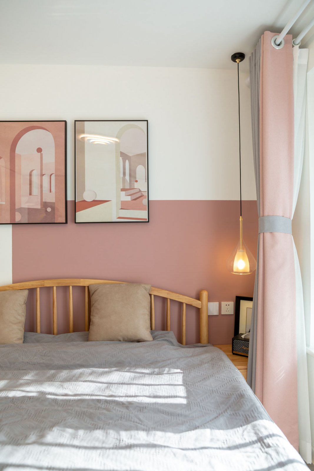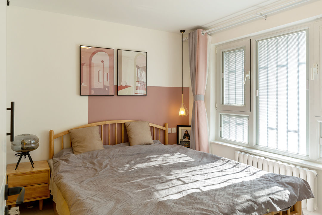 床头背景墙采用半墙式脏脏粉搭配,与客厅色调相呼应,搭配原木的温润自然,交织出清新宁静的羽然空间。