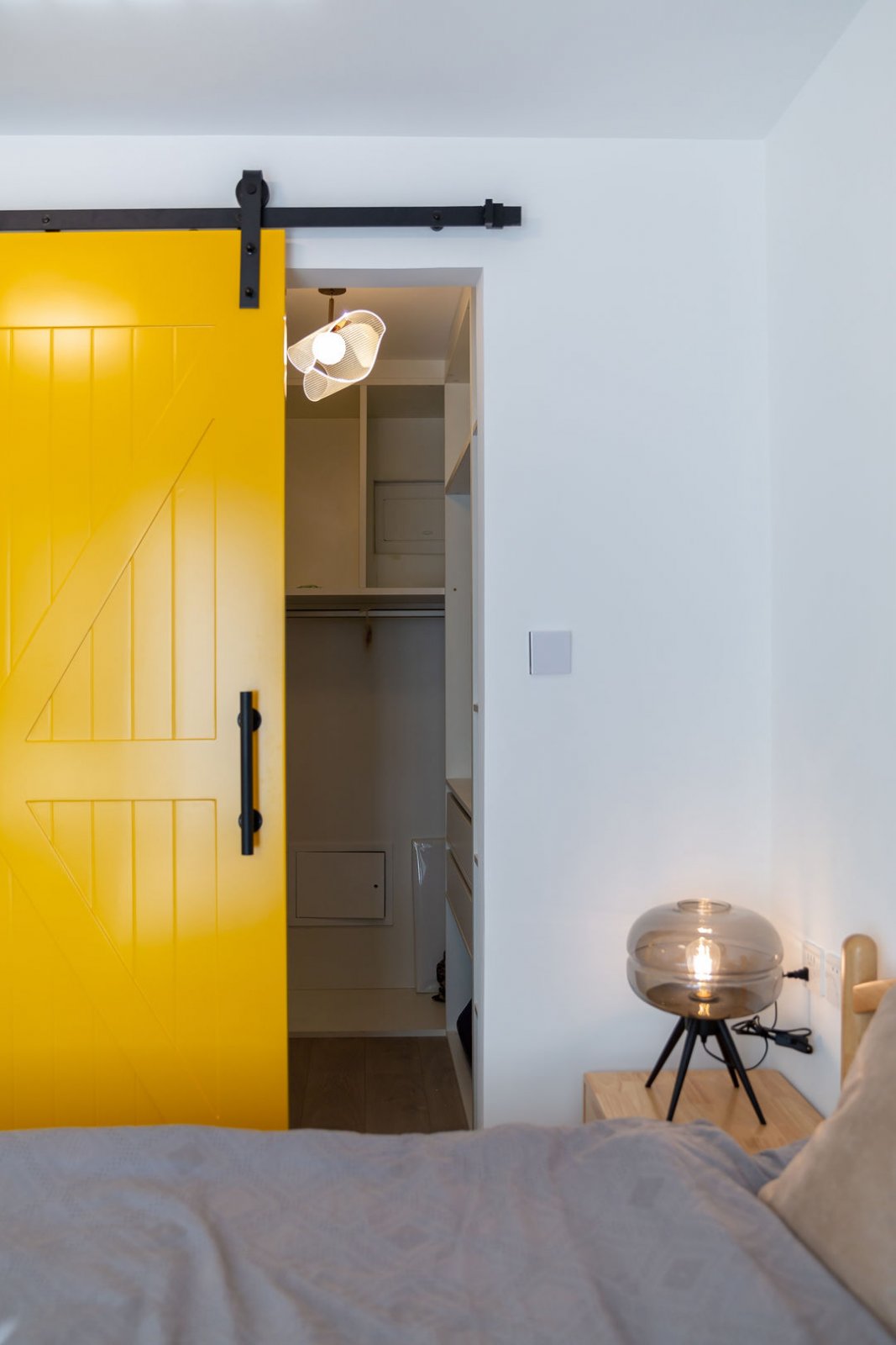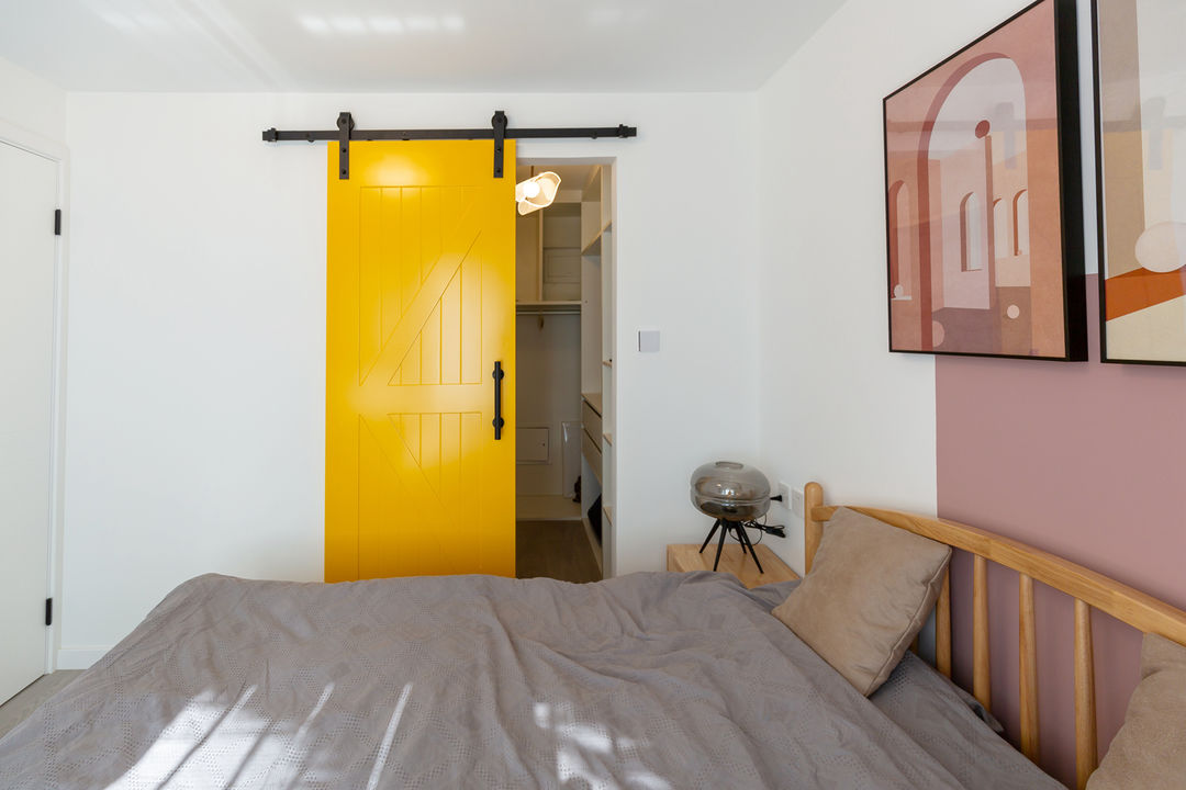 原主卧室和客厅互换位置,卧室空间由此变大,以至增加衣帽间空间,衣帽间选择用谷仓门做分割,黄色调的谷仓门点亮空间,增加卧室的趣味性 。