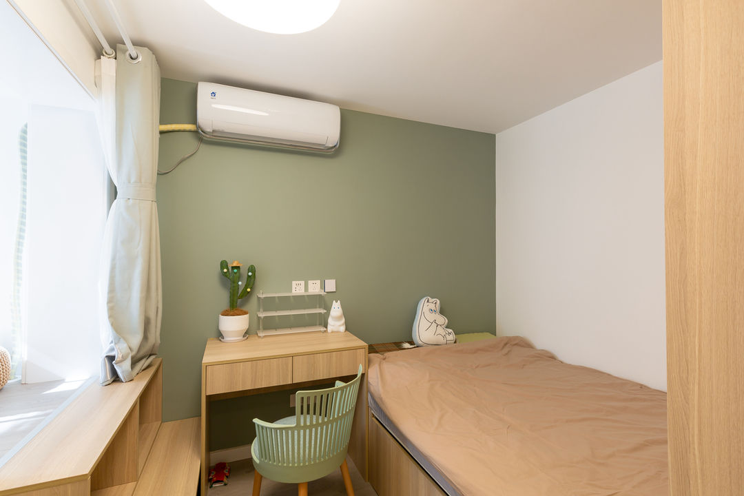 墙面整体以白色为主,背景墙以中性色系的灰绿色搭配,让空间色调不会过于单调,色调的搭配均适用于男孩和女孩居住