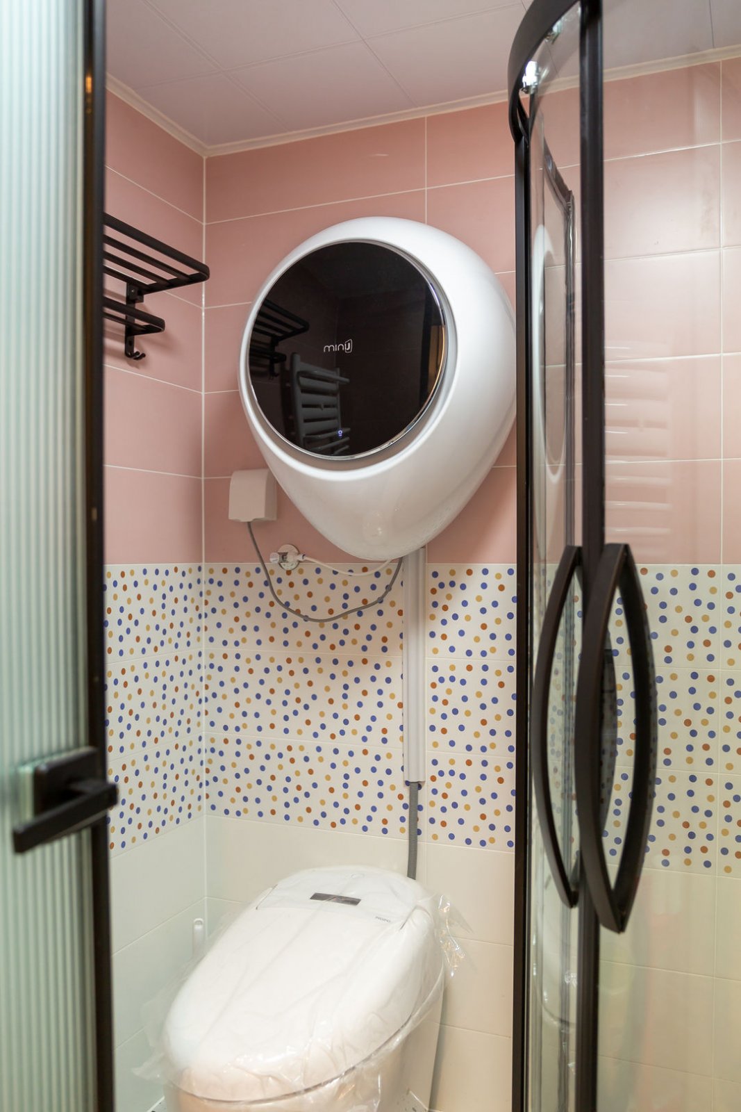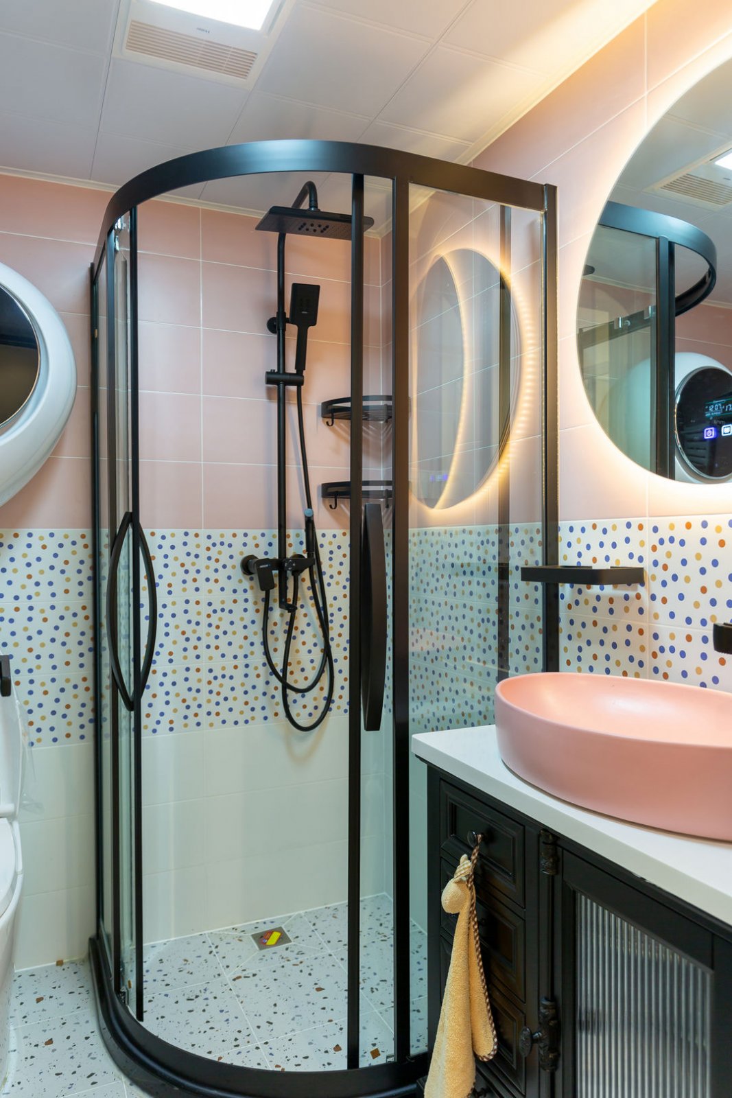 使用空间仅有5㎡的卫生间做干湿分离,玫瑰粉外置洗漱台兼化妆台,梳妆台镜面自带led灯,用来化妆也是赞不绝口