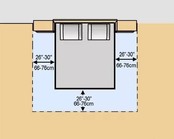 一般而言,床两侧及床尾预留约66-76cm用于走动和整理床铺是较自在的距离,如果卧室比较小的话也要有50cm-60cm,再少的话容易磕碰,走起来要小心注意就不爽了。
