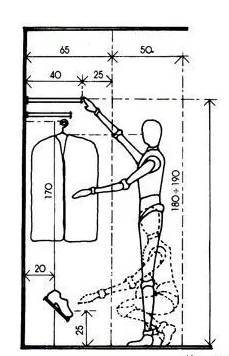 看下图,常规衣柜进深约60cm-65cm,而我们侧立或蹲下拿衣服约需50cm-55cm的位置,若要使用抽屉则位置还要再宽松一点。