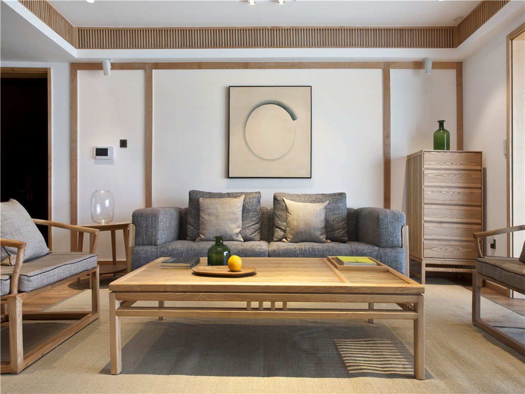 客厅选择比较低的沙发、茶几,有效地放大客厅的空间比例,坐下来时,采仰角的视线角度也会放大空间的感受,让客厅比想象中更开阔。