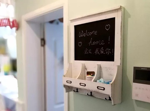 玄关的另一侧,一个小黑板的钥匙盒,黑板上写着甜蜜的话语,一回家就可以感受到温馨和甜蜜。钥匙盒的设计,也可以防止出门的时候,忘记带东西。