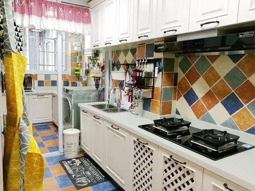 厨房的墙地面都是用了田园风的瓷砖,平铺和斜铺把空间划分,展现出层次感。厨房的边上是小小的生活阳台,洗衣晾衣就都集中在这里了。