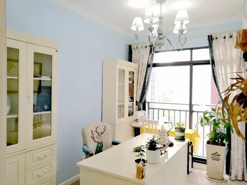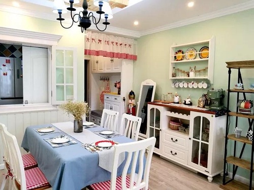 小户型装修走过玄关之后就是客餐厅空间,美式风的家具,搭配田园风的软装,整个空间都显得非常的清新亮丽。餐边柜加上多类型的收纳设计,让储物空间增加一倍。