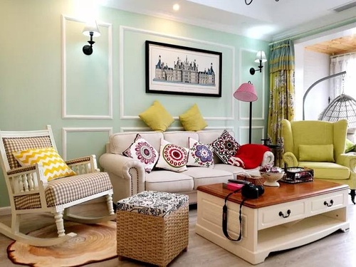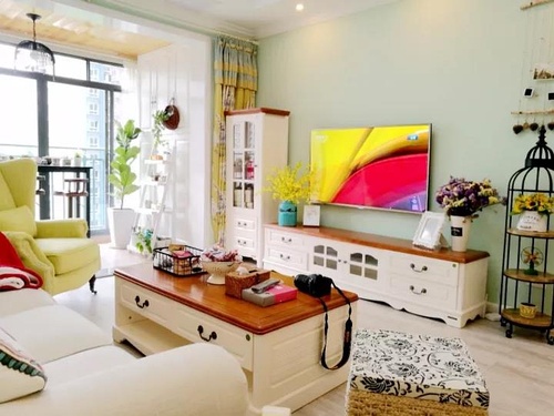 客厅的设计不算特别突出,延续了餐厅的嫩绿色的墙面,电视柜和茶几都是属于美式田园风常见的款式。