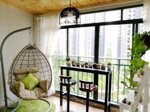阳台包进了客厅,小吊椅、吧台、绿植,都展现出满满的情调,颜色的搭配也非常有自然的气息,小清新的感觉超喜欢。