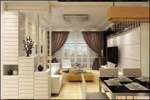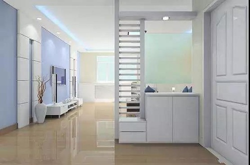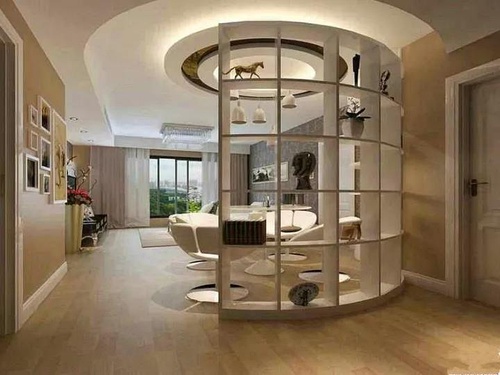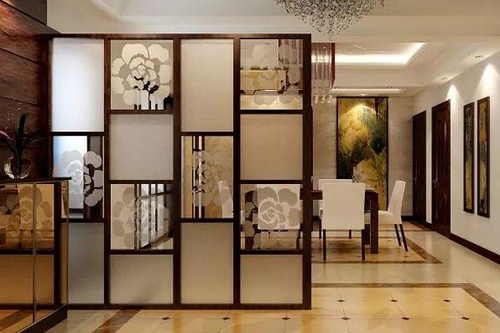 客厅玄关的间隔应以下面实心,防止外泄,上面以通透为主。因此可以用通透的磨砂玻璃或者空心的博古架之类的。