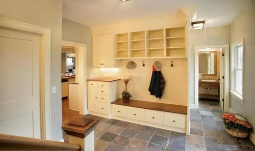 如果想让玄关的区域与客厅有所分别的话,可以选择铺设与客厅颜色不一的地砖,还可以把玄关的地面升高,在与客厅的连接处做成一个小斜面,以此来突出玄关的特殊地位。