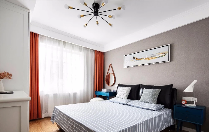 客厅也是铺的木地板,有个大窗户,设计长了飘窗的样式,可以说是很酷了!白色和深蓝色的 碰撞让人想到了复古风的欧洲。沙发的背景墙是灰色的,高级的颜色,墙壁上也只是用3幅绘画去做装饰,嗯完美~还有设计 别致的吊灯,充满艺术感。客厅利用窗户设计了飘窗柜,不仅增加了收纳空间,飘窗柜也可以做为休闲区,闲暇时看看 书,喝喝茶,坐在飘窗看看外面的风景,很实用,很惬意。色彩设计以大面积灰色调为背景色,用黄蓝对比色作为主色调提亮整个空间,顶面采用局部 边吊的形式,让空间有层次但不显压抑。餐座旁边是两个卧室,对面就是卫生间,设计合理,看着就显得空间大~浅浅的蓝色墙壁真的 好美~餐厅的位置也有别致的吊灯设计,餐座是原木的,有大自然的感觉。添加了工业元素的餐厅显得个性十足。主卧设计简洁实用,也不失品位与格调。卫生间干湿分区,减少了一个卫生间早上一起使用的麻烦,干区采用白色面包砖与浅绿色厨 卫漆搭配,湿区采用亮色六角砖及白色面包砖搭配,色彩明快舒适。