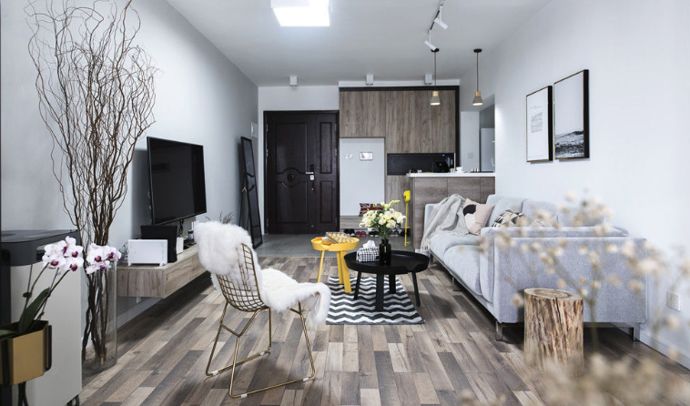 客厅,错色拼贴的木地板,自然地将客厅空间分隔出来。矮木墩、枯树枝的装饰,透露着原始自然的气息。搭配着金属休闲椅和金边挂画,于细腻中体现都市时尚感。家中的生活用品每件都是精挑细选,宁缺也绝不随意。卧室,飘窗处独具特色的升降书桌、床体隐藏的收纳空间、墙面温馨的嵌入式展柜、给有限的空间带来无限的遐想。