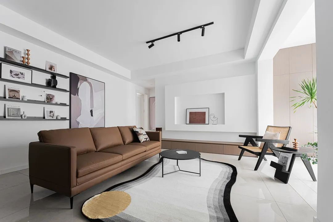 客厅给人的第.一感觉,就是简约大方。大面积使用白色,一定程度上提亮了空间,加上深色家具,和黑白相间的地毯,又不缺乏时尚气质。在照明设计上,以明装轨道射灯取代主灯,弱化了单一主灯对空间顶部的视觉干扰,让重.心集中在地面空间。