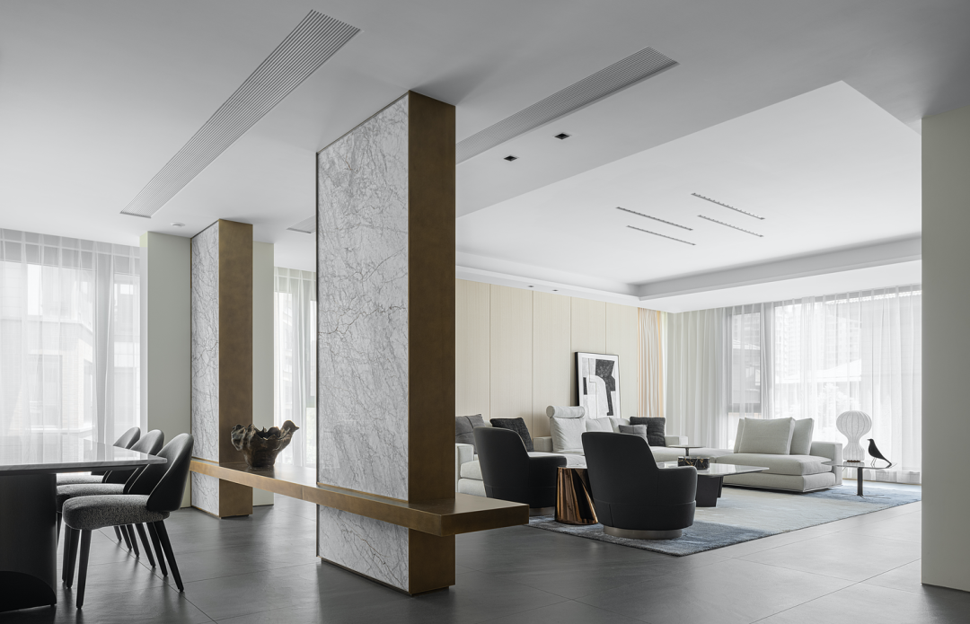 一个三层的顶层复式住宅,从入户到阁楼,这间422㎡的住宅于一片纯粹素雅中唤醒家的气质。返璞归真,观想设计用极简现代的设计风格,在忙碌的钢筋混泥土森林里勾勒出生活的轻松模样,拥抱静谧本真的生活,写尽现代东方诗意,打造心灵寄居之所。