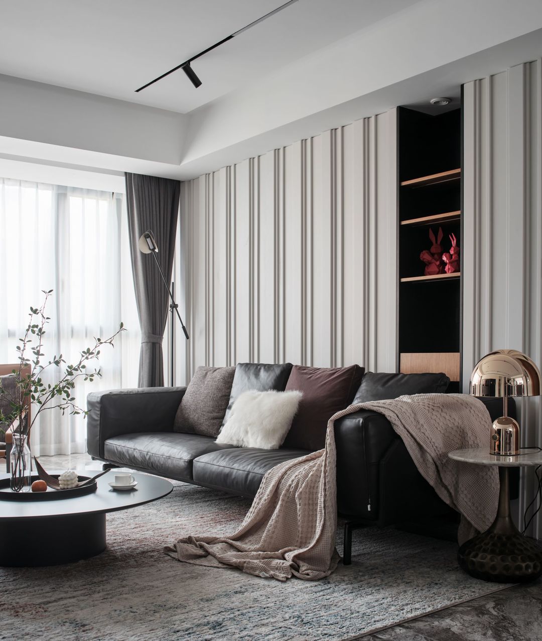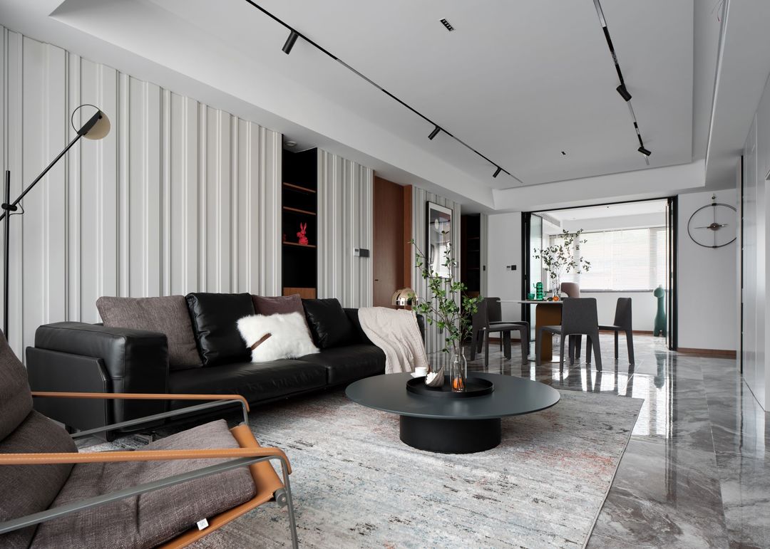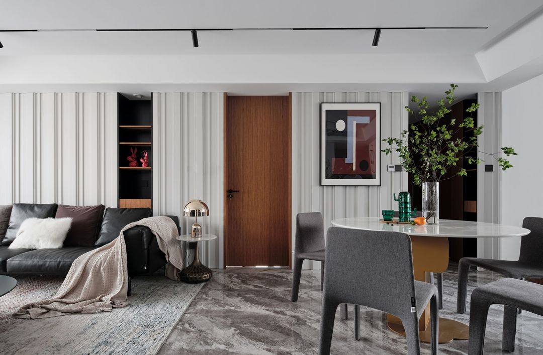 沙发背景墙设计的是灰白色不规则纵向木饰面,拉伸纵向延伸感,中间做黑色敞开格,做横向敞开格来打破纵向的单调,既满足了收纳,也充满了设计感。
