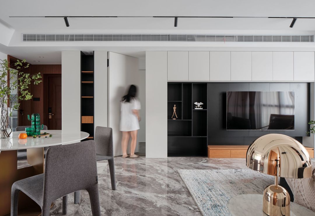 电视背景墙与玄关处一体设计,为了避免次卧门打破背景墙的整体感,设计了隐形门,与主卧门一样的一门到顶设计,空调出风口做了一整排的设计,里面做挡板刷黑,让整个空间看起来连贯。