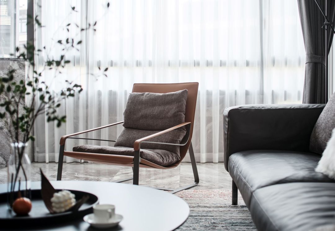休闲椅的活泼色调搭配上黑色沉稳的沙发,别有一番风味。